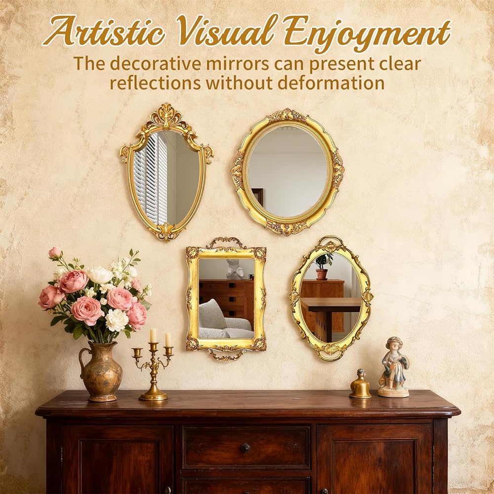 • Premium Material: These gold decorative mirrors are crafted from premium plastic for long-lasting durability. Their intricate gold detailing allows them to harmonize with diverse interior design styles while making spaces appear more open and bright.