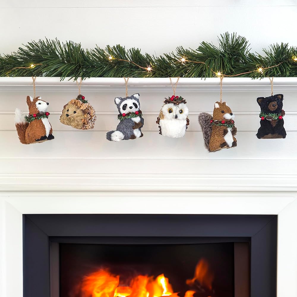 Naturevibe السيزال الغابات الحيوانات الحلي شجرة عيد الميلاد، مجموعة من 6 أصدقاء الغابات الطبيعية مع صناديق الهدايا للهدايا، والحيوانات الحلي كديكورات منزلية ريفية