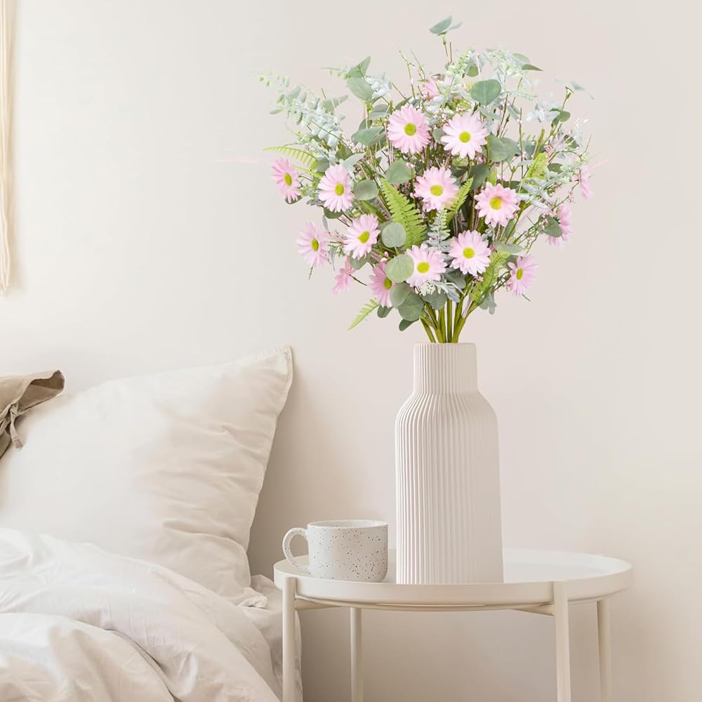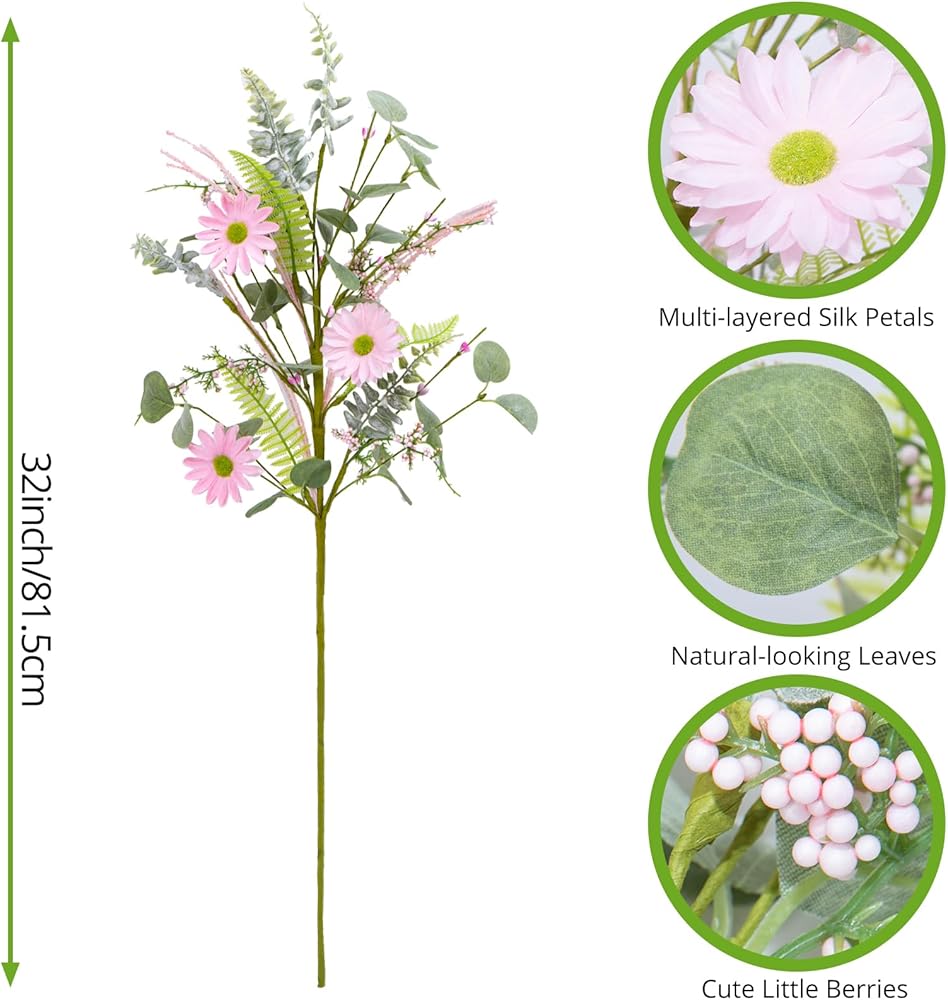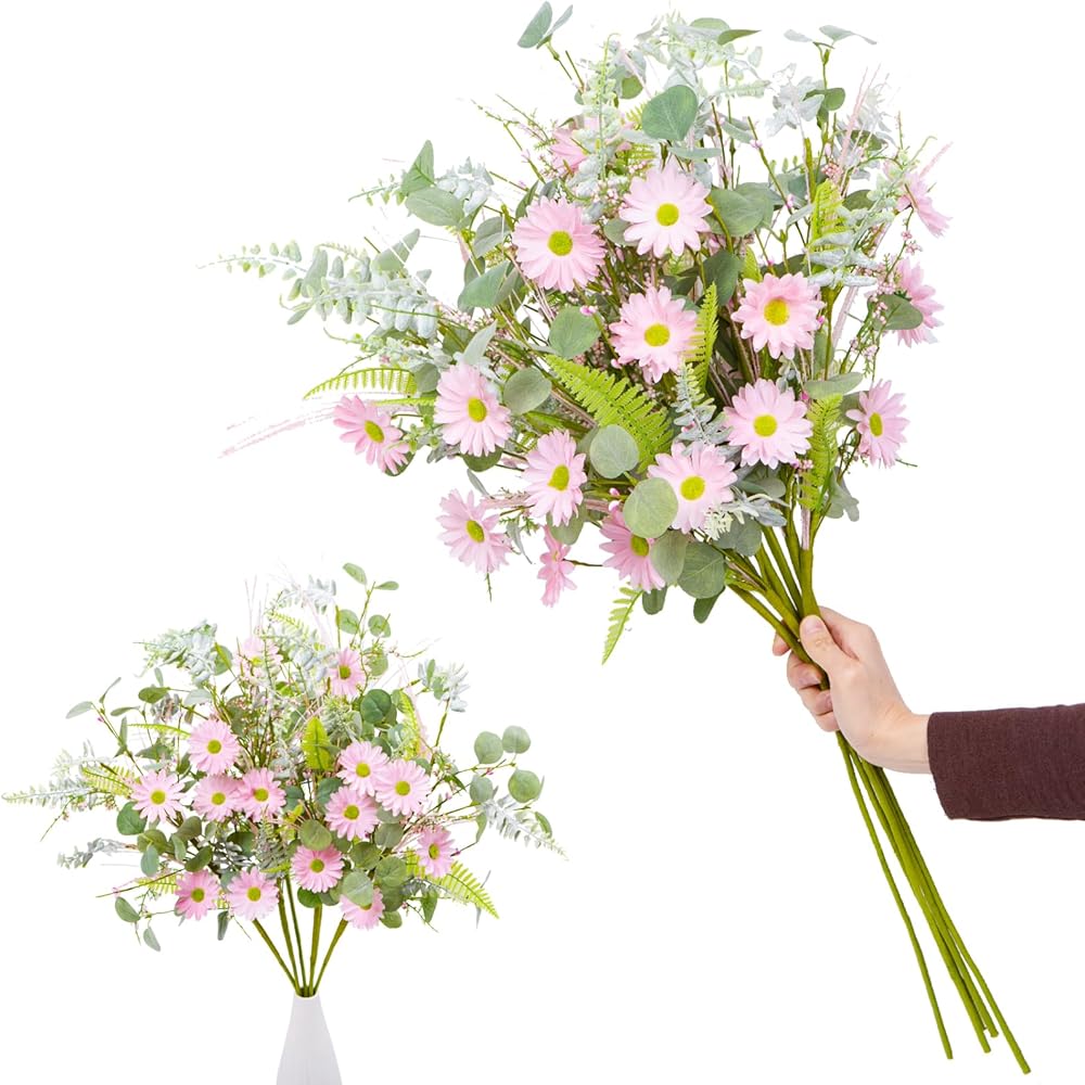 Spring Summer Artificial Flower Bouquet -5 Bundles of 25 Faux Pink White Daisies &Greenery Stems- 24 Inch Realistic Silk Floral Arrangement for Home, Wedding, and DIY Décor