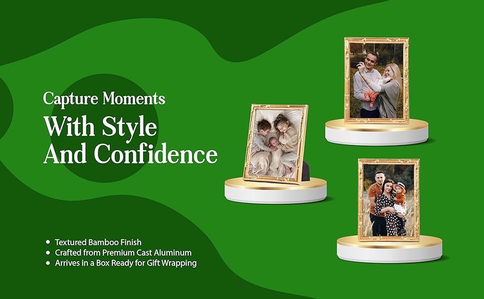 تصميم كلاسيكي من الخيزران الذهبي - يجمع إطار الصورة المصنوع من الخيزران الذهبي مقاس 5x7 بين الأناقة الخالدة والتفاصيل الفاخرة. مصنوعة من الألومنيوم المصبوب الفاخر، وتتميز بحدود معقدة على شكل الخيزران تعزز أي مساحة بينما تعرض صورك المفضلة بشكل جميل.