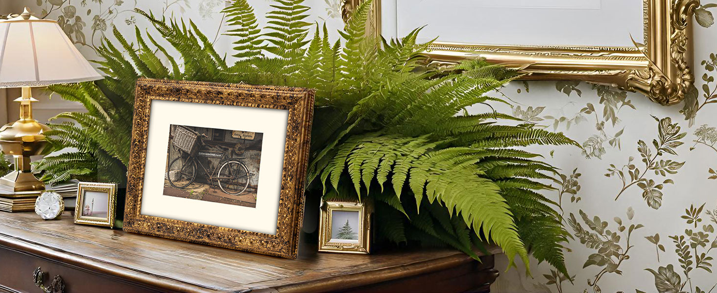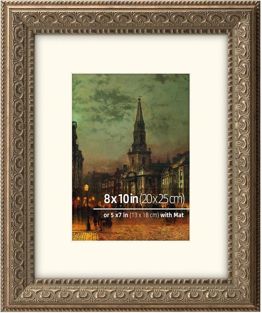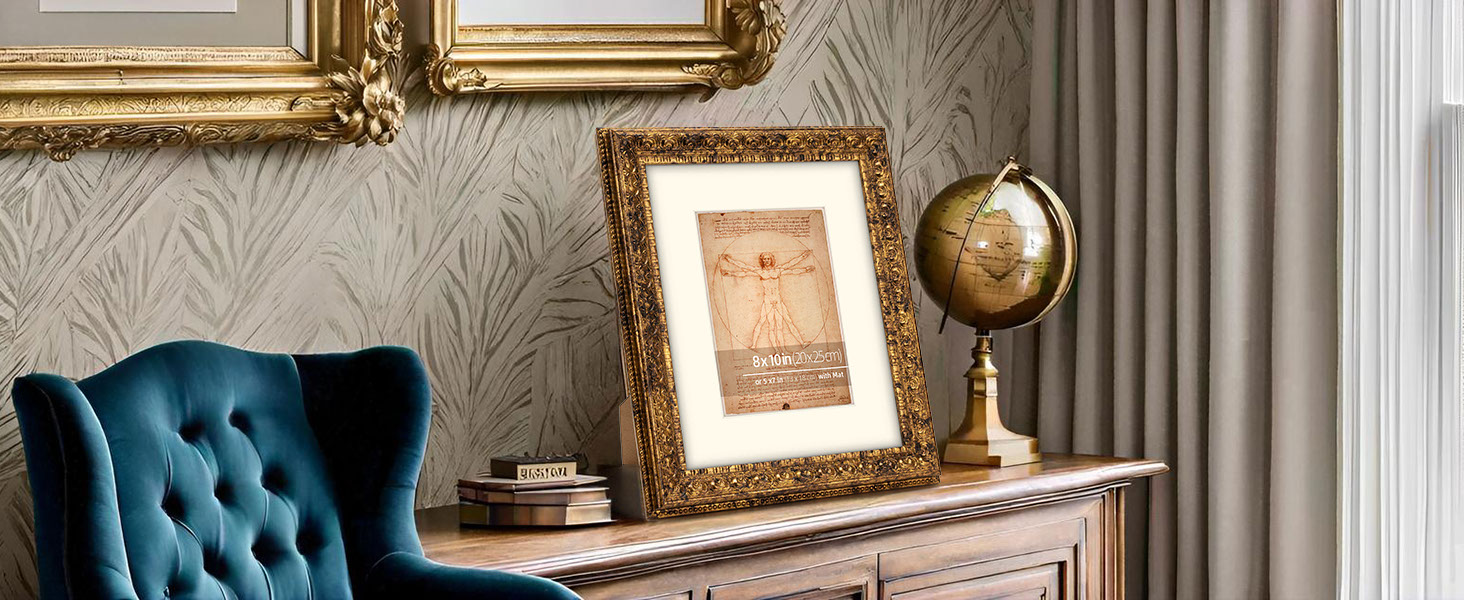 شكل الإطار مطلي بأوراق ذهبية ريفية معدنية معتقة، ويتناسب مع مجموعة متنوعة من الأسطح، بما في ذلك الجدران والأثاث والخزائن. يبلغ مقاس الإطار المزخرف 1.25 بوصة عرضًا × 1 بوصة ارتفاعًا، ويناسب إطار الصورة هذا بشكل مثالي صورة مقاس 11 × 14 بوصة بدون حصيرة أو صورة مقاس 8 × 10 بوصة مع حصيرة. (ملاحظة: حجم فتحة السجادة الفعلي هو: 7.6 × 9.5 بوصة).