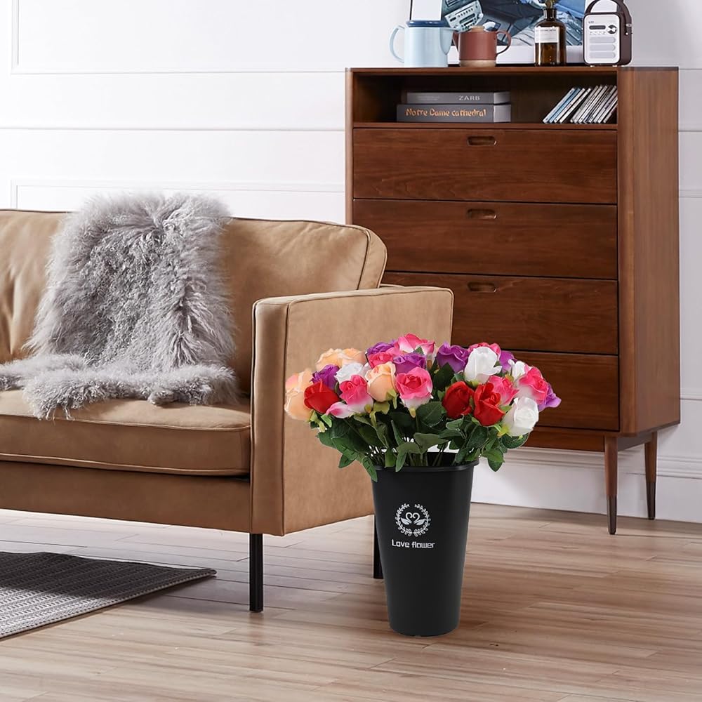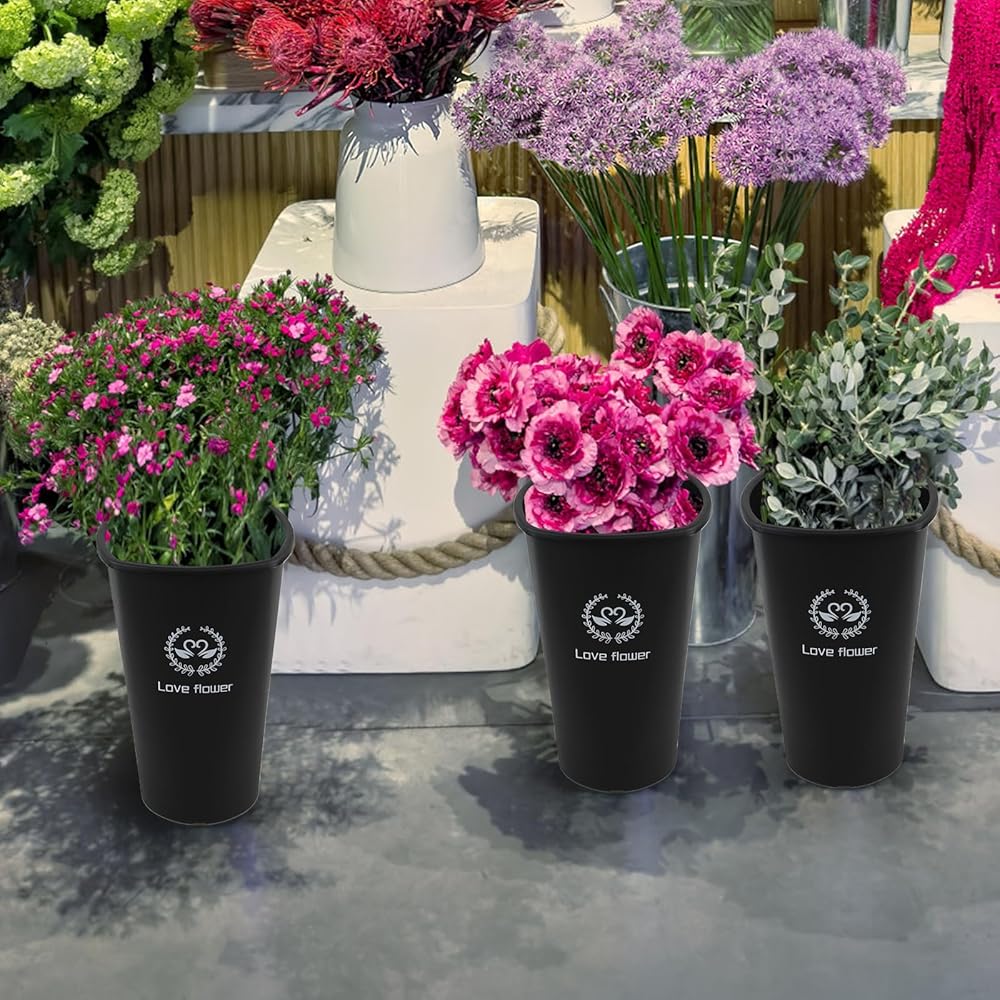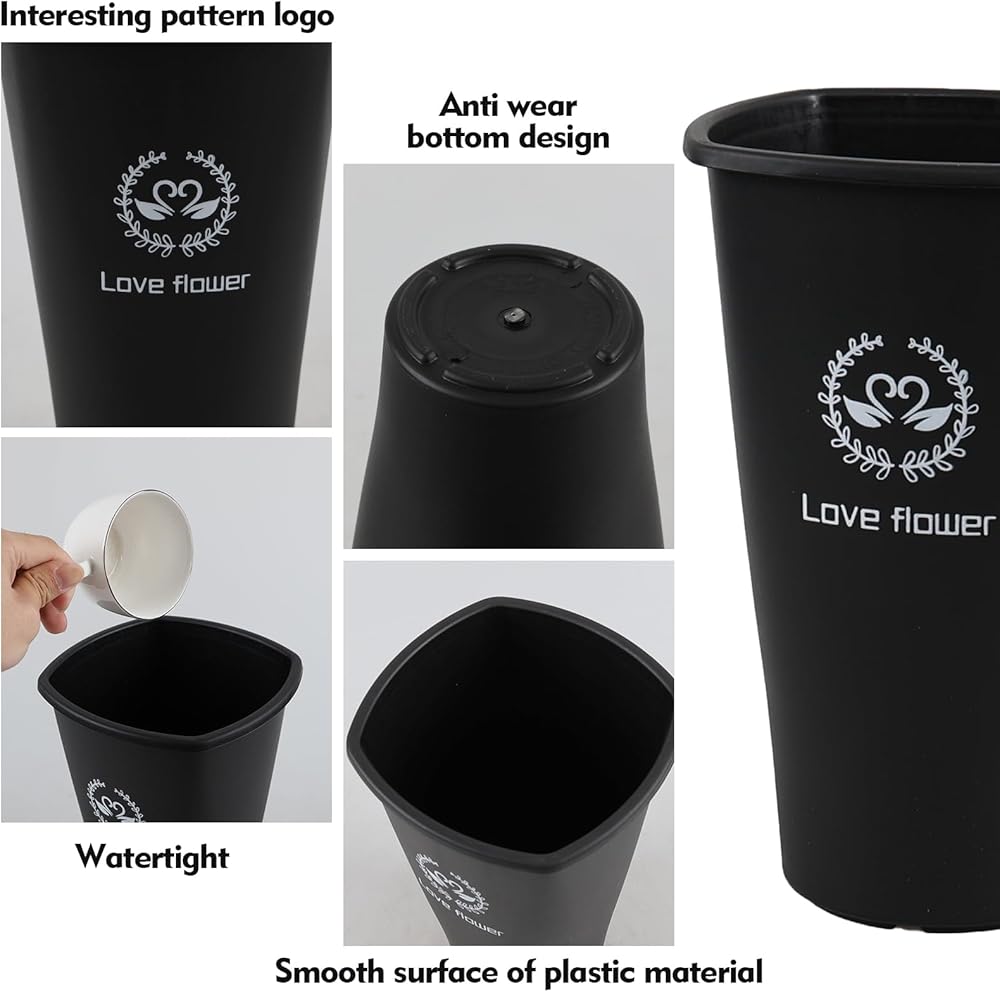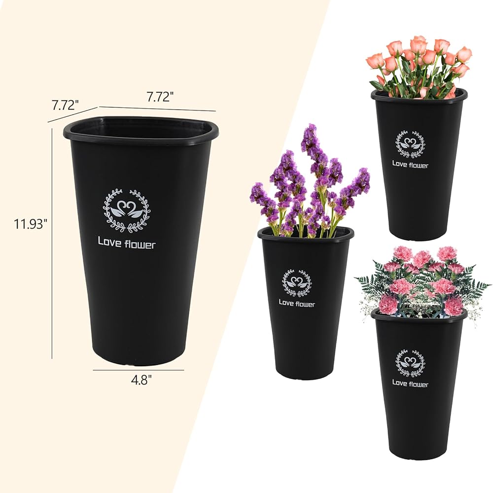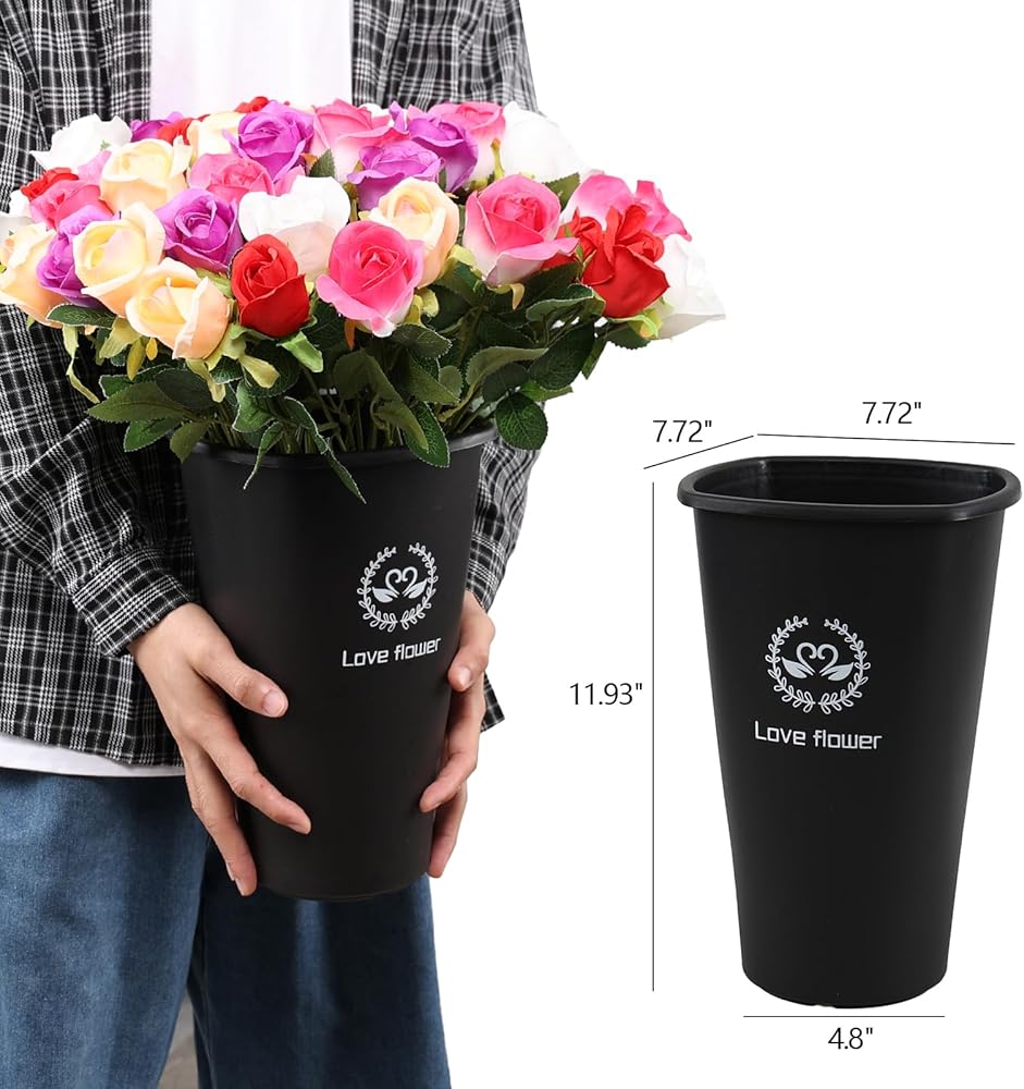 - Black plastic bucket vase is about 11.93" in height, 7.72" x 7.72" in top size and 4.8" in bottom diameter