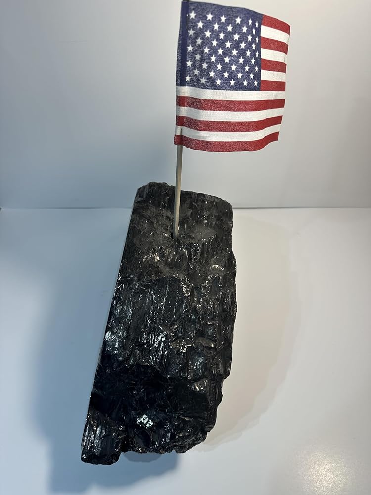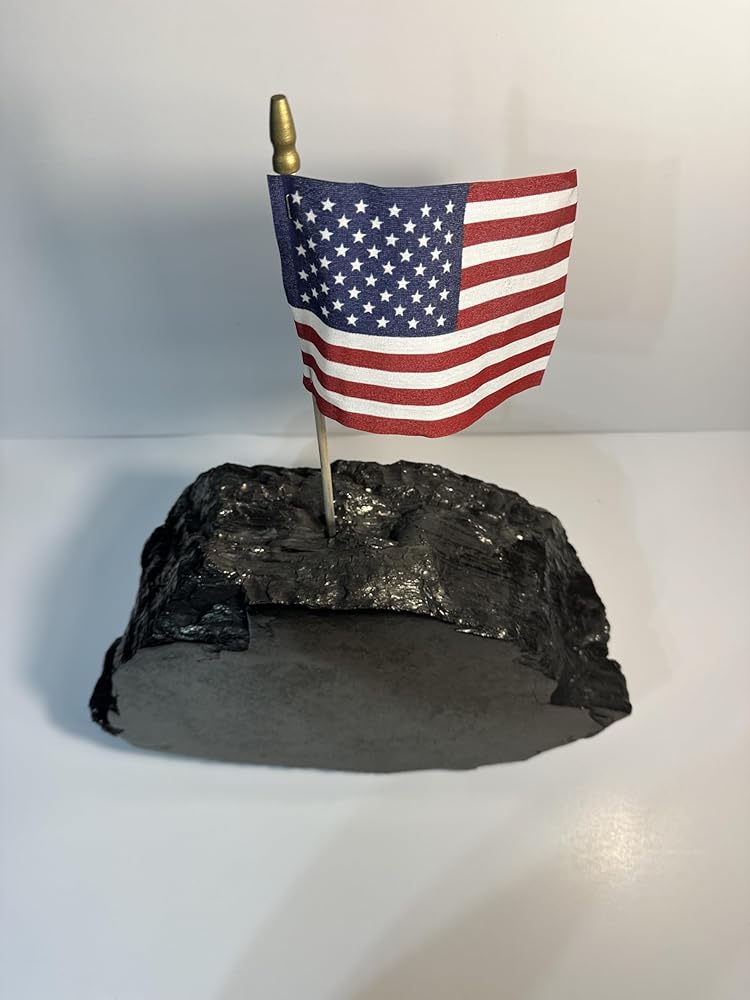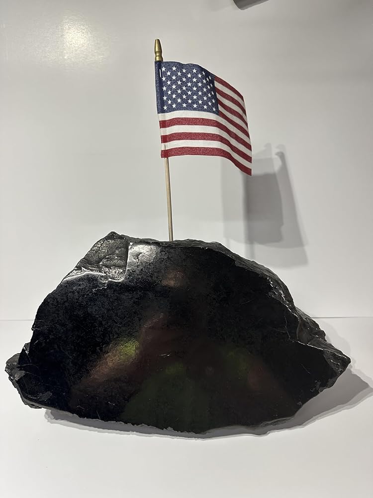 Showcase a piece of America's natural resources with this stunning Natural Anthracite Coal Display Piece. This polished black mineral specimen features a glossy, reflective surface that highlights the natural beauty and unique characteristics of anthracite coal. Each piece is carefully sanded and polished to bring out its lustrous appearance while maintaining its raw, natural edges. The display comes paired with a small American flag, creating a patriotic desk accent that celebrates both American heritage and natural resources. Perfect for geology enthusiasts, collectors, history buffs, or as a distinctive conversation piece for your home or office. The substantial weight and solid feel of this genuine anthracite specimen makes it an impressive paperweight or decorative item. Each piece is unique in shape and exact appearance, showcasing nature's artistry in this high-carbon fossil fuel that helped power American industry.