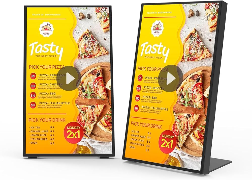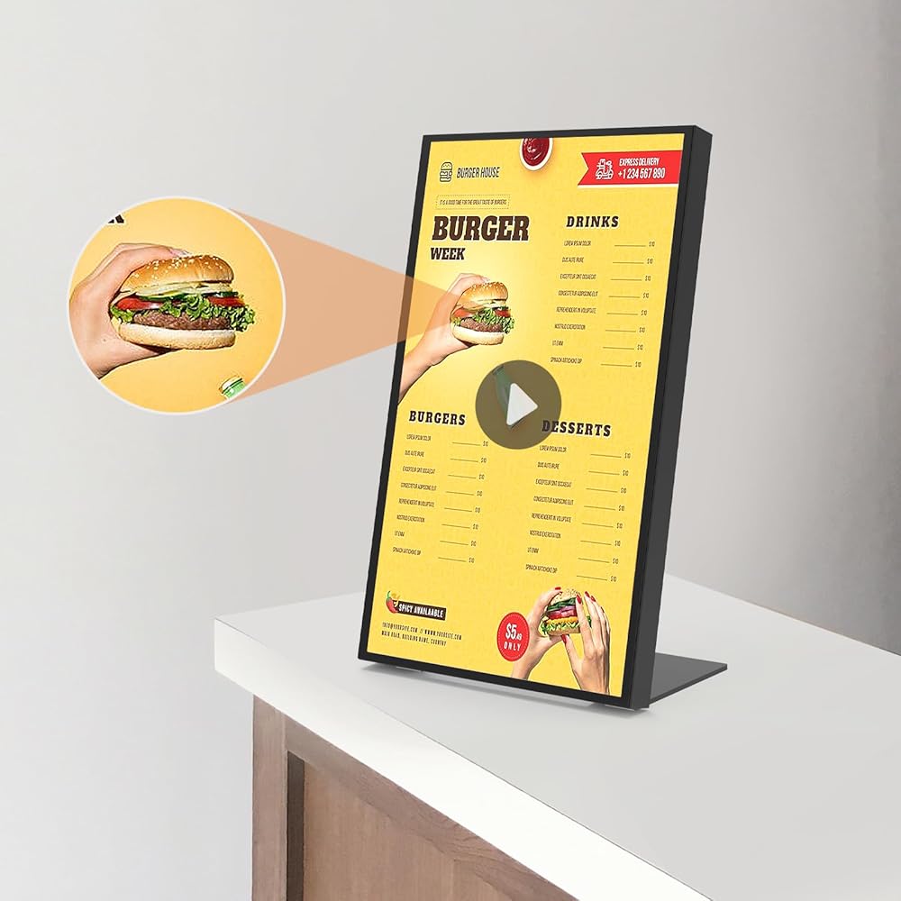 【صناعة متقنة】: تتميز لوحات القائمة الرقمية للمطاعم بإطار مصنوع بدقة يجمع بين سبائك الألومنيوم عالية القوة والزجاج المقسى القوي. وهذا يضمن متانة استثنائية مع الحصول على مظهر نحيف للغاية. مقترنًا بإطار أسود عميق، فإنه ينضح بإحساس الجودة الصلبة والمكررة في كل التفاصيل، مما يخلق بشكل جماعي أجواء تكنولوجية حديثة قوية.