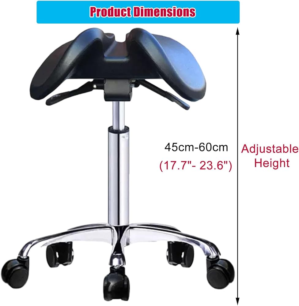 Heavy Duty Stainless Steel Massage Stool:Designed for professionals who spend long hours seated and require mobility, our Saddle Stool offers exceptional comfort and support for your spine. Experience enhanced posture, which contributes to improved productivity during your workday. **Product Specifications:** - **Product Name:** Saddle Stool - **Maximum Load:** 200KG (440 lbs) - **Base Material:** High-Quality Aluminum Alloy - **Wheel Type:** PA Nylon Frame with PU Rubber Edge Wheel - **Adjustable Height:** Available in 45-60 cm (17.7"- 23.6"), 52-70 cm (20.5"- 27.5"), and 44-60 cm (17.7"- 23.6) **Key Features:** - Promotes proper sitting posture, alleviating spinal pressure. - Ergonomically designed seat contours to your body for comfort and stability. - Equipped with 360° rotating wheels for effortless movement and impressive load capacity. - Features a thickened steel lift lever for easy height adjustment with one hand. - Perfect for hairdressers, beauticians, barbers, dentists, tattoo artists, and other professionals seeking mobility and comfort. **Package Includes:** - 1 x Saddle Chair (with mounting accessories) **Important Notes:** - Please allow for a 1-2 cm variance in manual measurements. - Color may slightly differ from images due to monitor and lighting variations. **Customer Support:** - For any inquiries, feel free to reach out to us anytime. We offer 24-hour customer service to assist you. Enhance your workspace with our Office Lift Split Style Saddle Stool, a versatile and ergonomic solution for anyone in need of a reliable rotating hydraulic chair.