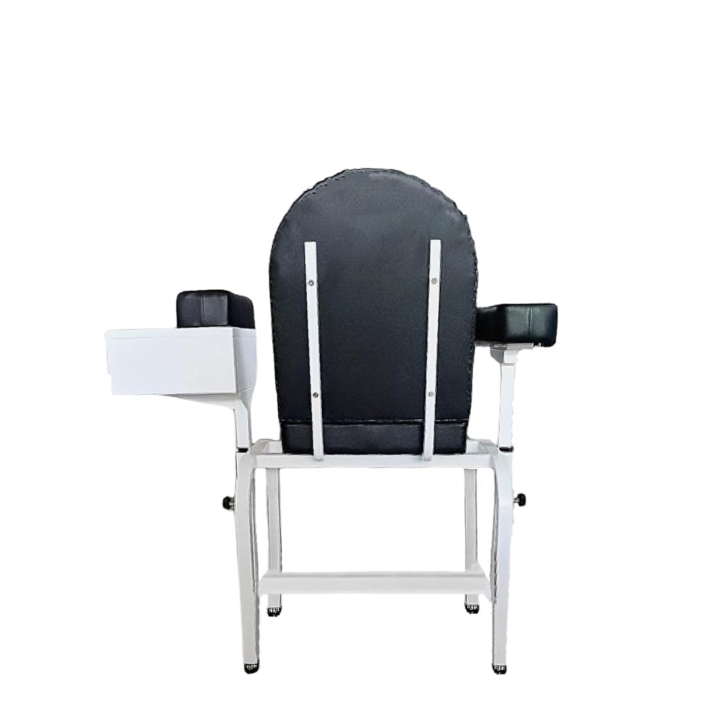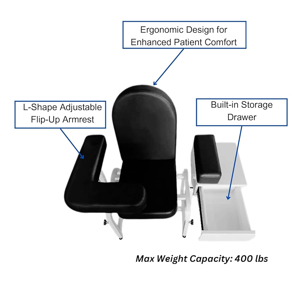 مقعد مبطن مريح ومسند ذراع قابل للتعديل: يتميز كرسي سحب الدم بارتفاع إجمالي 36.25 بوصة، وارتفاع المقعد 17.15 بوصة، ومقعد بعرض 20 بوصة مع بطانة سميكة بسمك 2 بوصة على المقعد ومساند الذراعين ومسند الظهر لتوفير الراحة. يمكن قلب مسند الذراع القابل للتعديل وتثبيته في مكانه، مما يجعله مثاليًا لسحب الدم وفحص ضغط الدم.