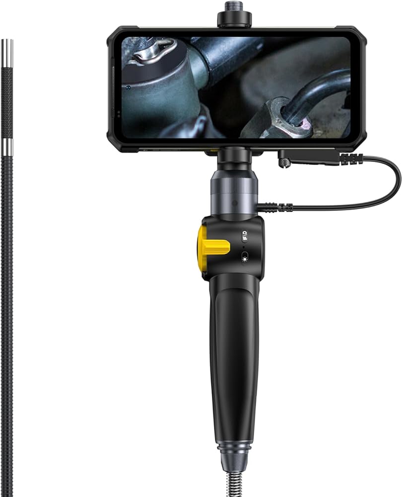 • Easy-to-operate Handle: The handle includes shortcut buttons to adjust the brightness of LEDs, capture photos, and record videos, with a phone holder on top, it is easy to operate the endoscope while simultaneously checking the screen, making it convenient for users to complete inspection tasks.