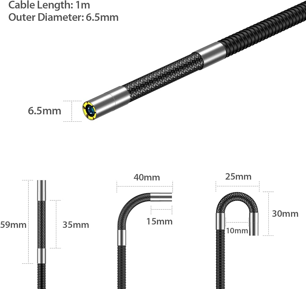 • IP67 Waterproof Cable and Camera: The 1m semi-rigid gooseneck cable can unroll and roll up quickly, offering a blend of flexibility and rigidity. With a lens diameter of 6.5mm, the probe can be precisely positioned in confined spaces.