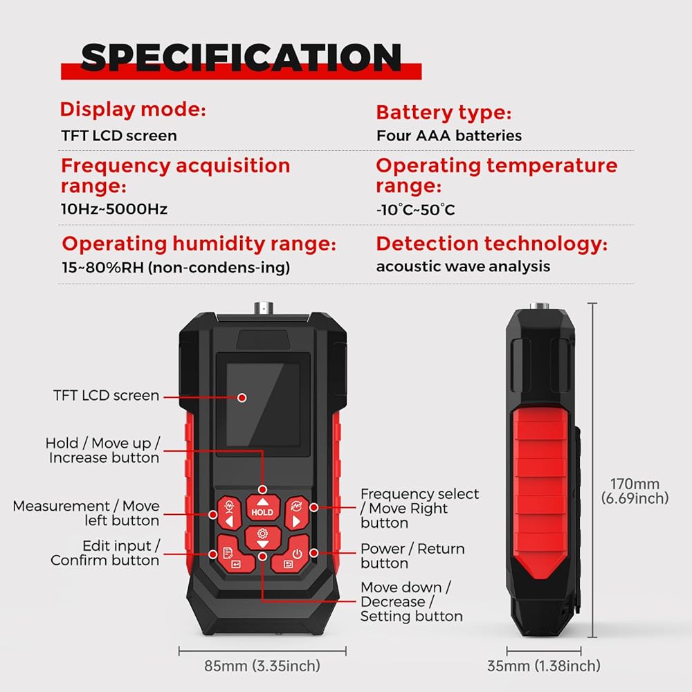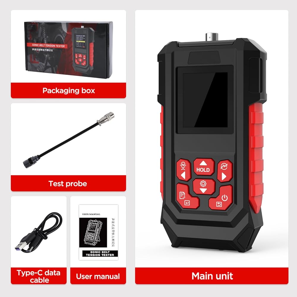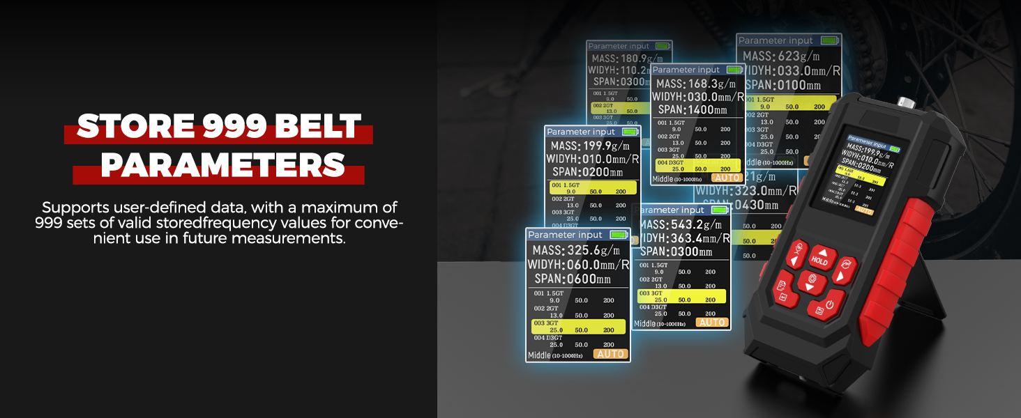 جهاز اختبار شد الحزام الصوتي، مقياس شد الحزام من 10 هرتز إلى 5000 هرتز، جهاز اختبار شد الحزام 999.9 ملم مع شاشة TFT LCD، قياس سريع صوتي، وضع قياس فردي/مستمر، 999 مجموعة من مجموعات تخزين البيانات