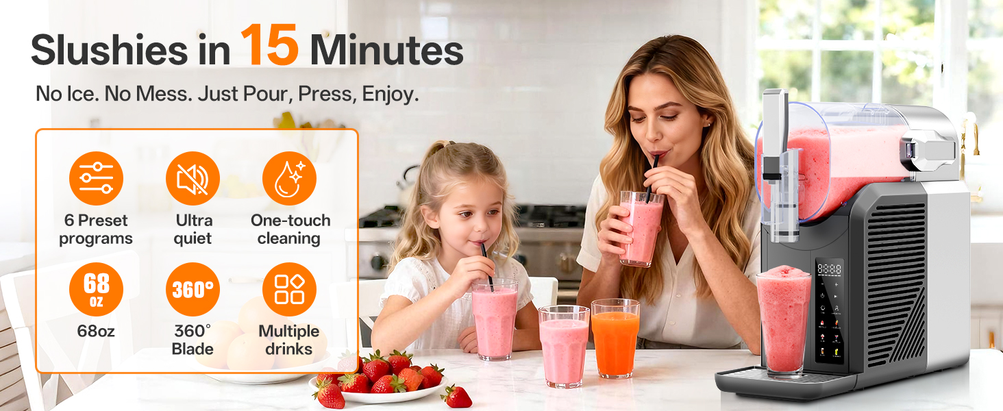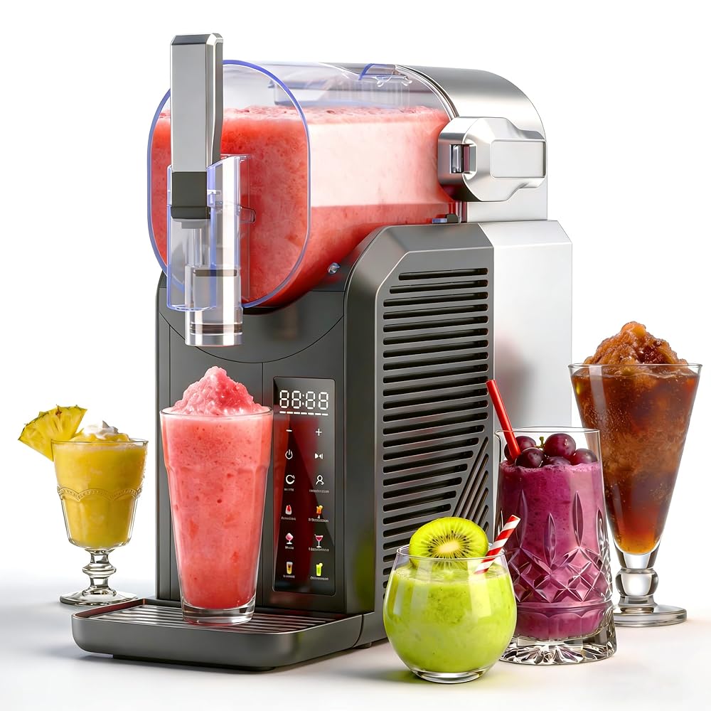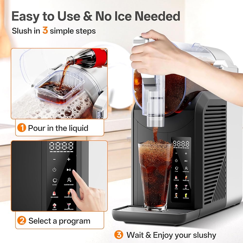 تشغيل بدون مجهود بلمسة واحدة - ما عليك سوى الصب والاختيار والاسترخاء. تعمل عملية التشغيل بلمسة واحدة على جعل المشروبات المجمدة سهلة، بينما يتيح لك وضع السلاش القابل للتعديل ضبط السمك بشكل دقيق من الناعم إلى الجليدي للغاية. المقبض المريح يسمح بسهولة التعبئة والصب بدون فوضى من أجل الراحة اليومية.