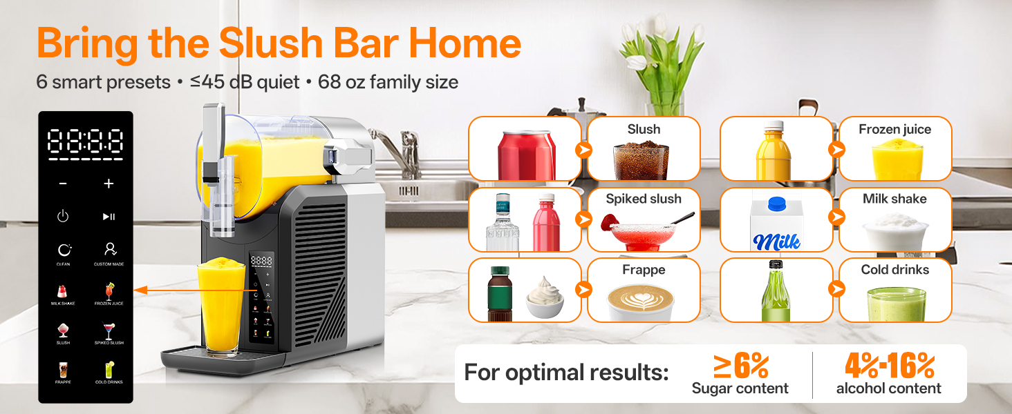 أوضاع المشروبات المعدة مسبقًا 6 في 1 - تخطي متاعب الثلج والعمل التحضيري. مع 6 برامج ذكية معدة مسبقًا - السلاش، والسلاش المسنن، والميلك شيك، والعصير المجمد، والفرابيه، والمشروبات الباردة - يمكنك الحصول على نتائج مثالية بلمسة زر واحدة. نصائح: تأكد من أن محتوى السكر أعلى من 6%. يجب أن تحتوي المشروبات التي تحتوي على الكحول على 4-16% كحول. لا تصنع طين بدون سكر.