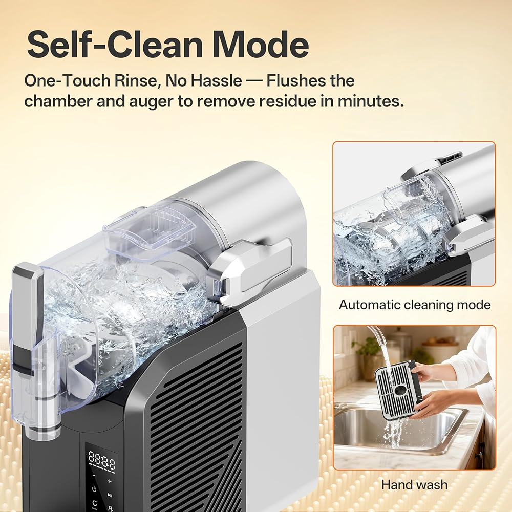 سهولة التنظيف والصيانة - تخطي الغسل الممل باستخدام وضع التنظيف الذاتي المدمج. يقاوم الإطار المصنوع من الفولاذ المقاوم للصدأ البقع والروائح لتجربة أكثر صحية. للتنظيف العميق، يتم فتح المقبض الخلفي لإزالة البرميل والأجزاء بسهولة، بينما تحافظ صينية التنقيط القابلة للإزالة على نظافة سطح الطاولة.