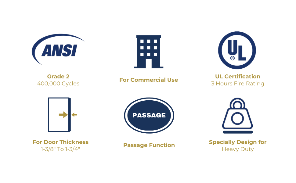 يناسب سُمك الباب القياسي والمجموعة الخلفية: متوافق مع الأبواب السميكة 1-3/8 بوصة إلى 1-3/4 بوصة ويأتي مع مزلاج ANSI خلفي 2-3/4 بوصة، مما يوفر ملاءمة دقيقة للتطبيقات التجارية القياسية.
