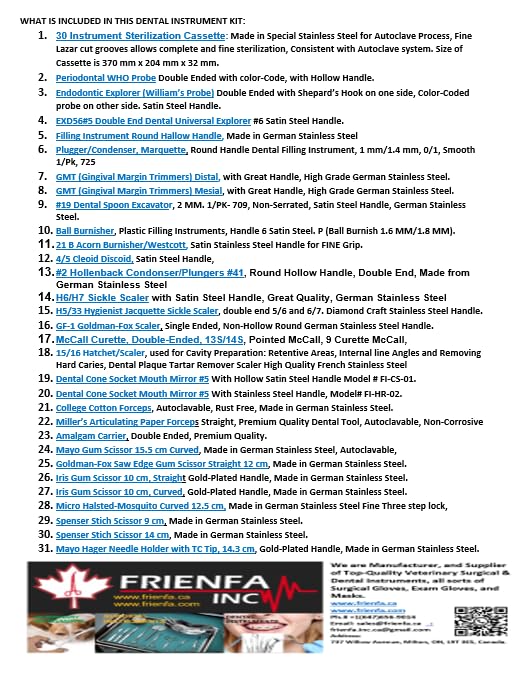 30 مجموعة أدوات طب الأسنان الأساسية مع كاسيت تعقيم عالي الجودة من Frienfa، خالية من الصدأ، قابلة للتعقيم، مصنوعة من الفولاذ الألماني المقاوم للصدأ، تدوم طويلاً، ضمان مدى الحياة