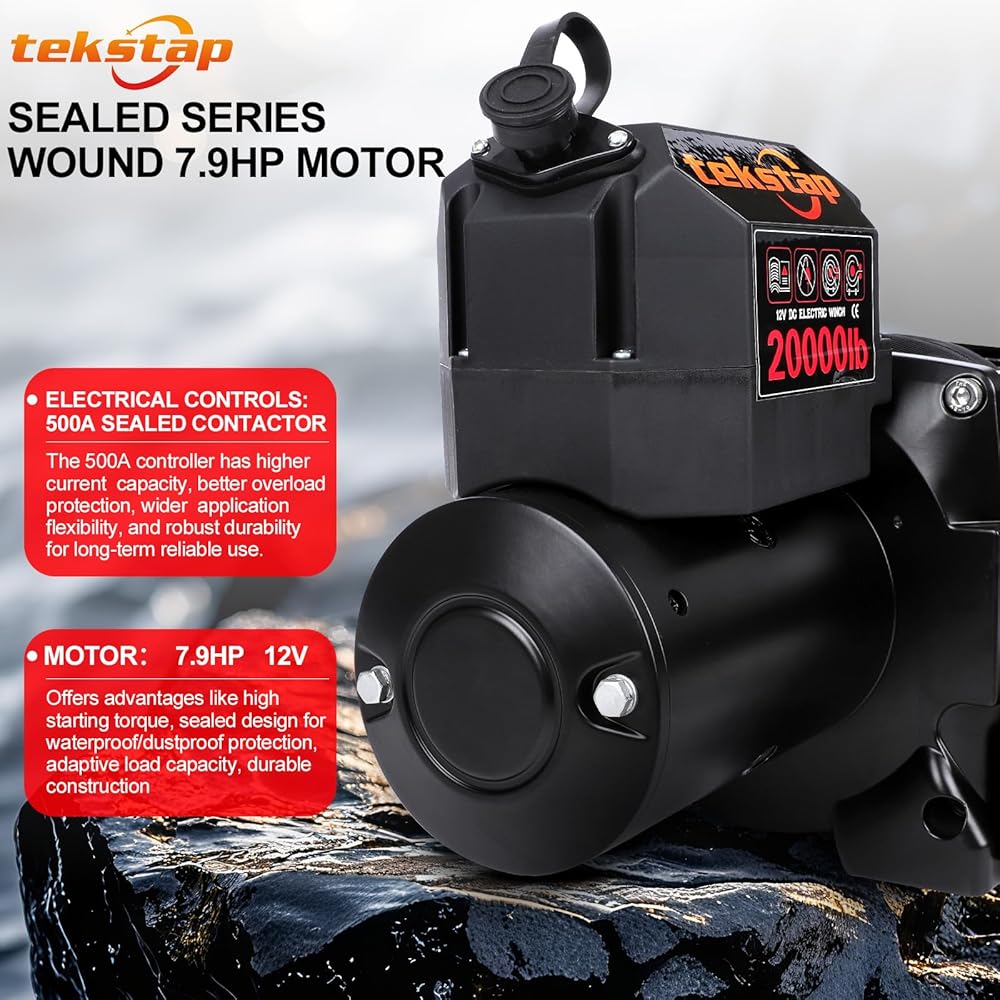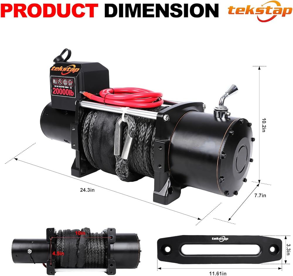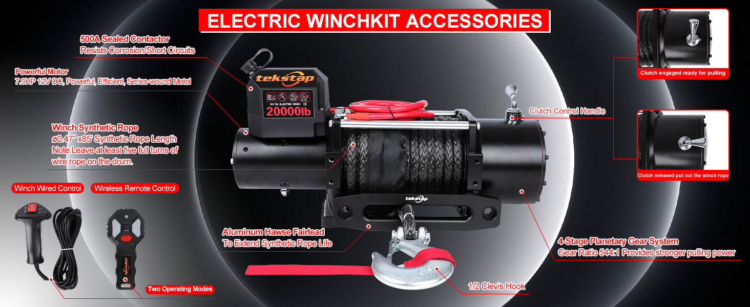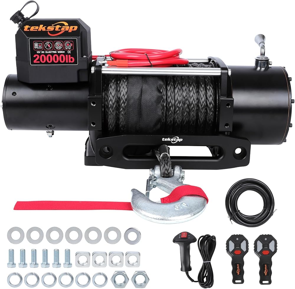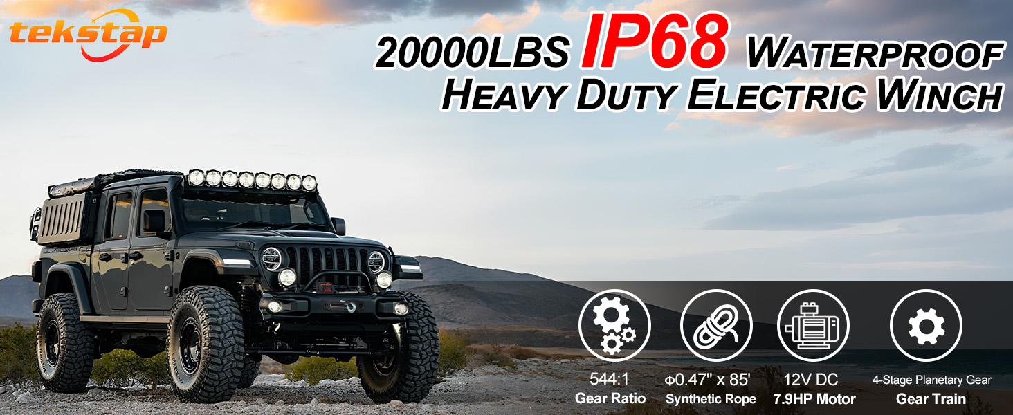 ونش كهربائي ثقيل 20000 رطل، IP68 مقاوم للماء 12 فولت تيار مستمر مع حبل صناعي 0.47 بوصة × 85 قدم، محرك 7.9 حصان، تروس كوكبية 4 مراحل 544: 1،2 جهاز تحكم عن بعد لاسلكي، للشاحنة/الجيب/سيارات الدفع الرباعي على الطرق الوعرة