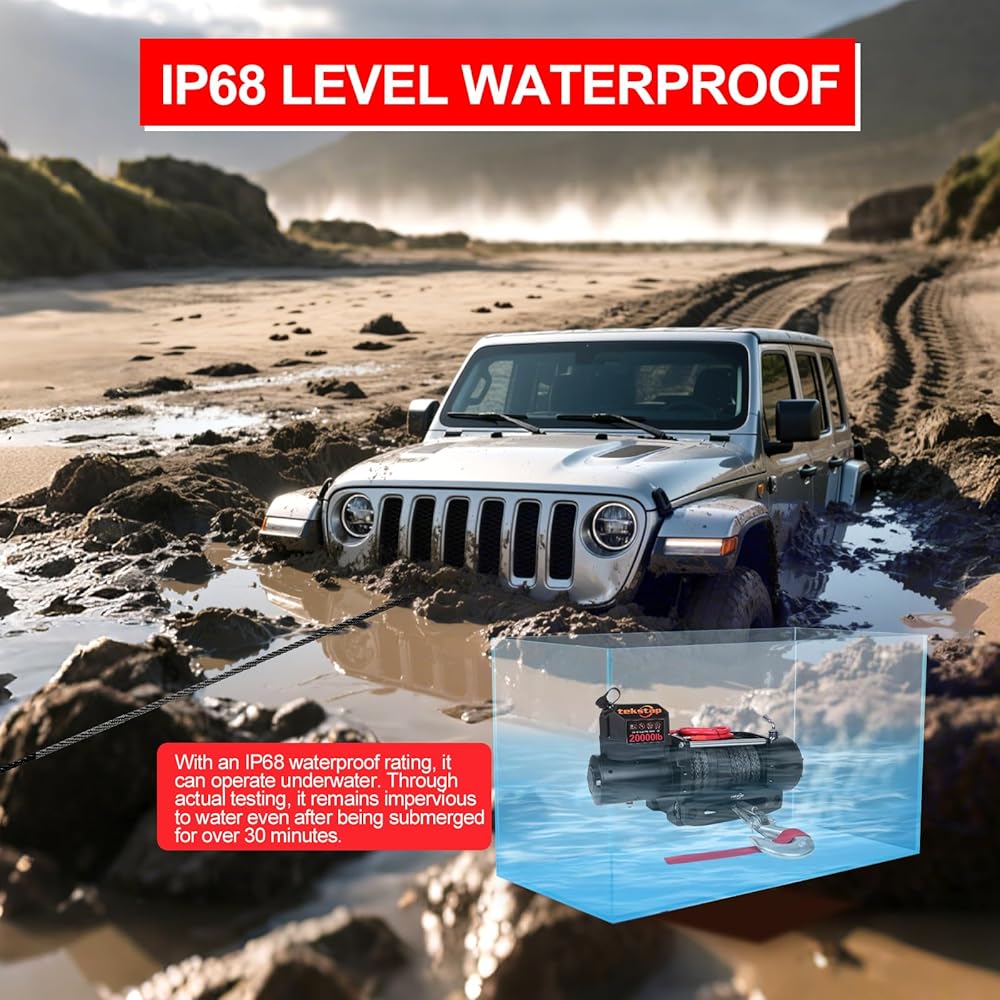 سحب 20,000 رطل + مقاومة الغمر IP68: قهر أي تضاريس، سحب أحادي الخط بوزن 20,000 رطل يتعامل مع الشاحنات/سيارات الجيب بسهولة! رافعة IP68 - تتحمل أكثر من 30 دقيقة مغمورة في الماء (تم اختبارها ضد الطين والأنهار وعمليات الإنقاذ الممطرة). المحرك/الموصلات محكمة الغلق مقاومة للتآكل - لا يوجد أي فشل في "الأضرار الناجمة عن المياه"، حتى في ظروف الطرق الوعرة القاسية