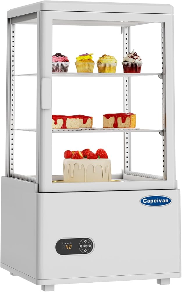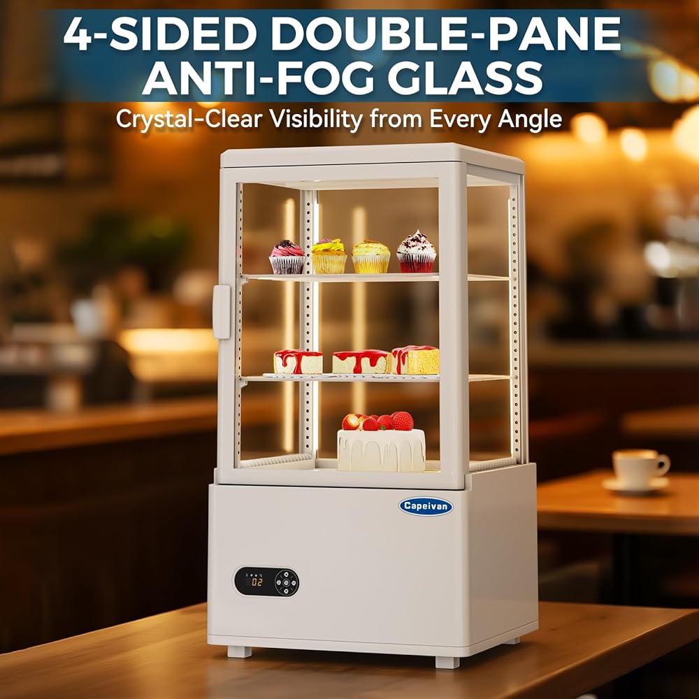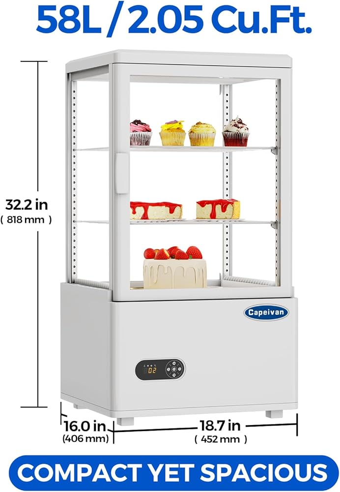 ثلاجة عرض المعجنات على سطح الطاولة باللون الأبيض، سعة 2.05 قدم مكعب / 58 لترًا، مع ضوء LED، وزجاج خالٍ من الصقيع، ومنظم حرارة رقمي، وتصميم من طبقتين لمطعم المقهى