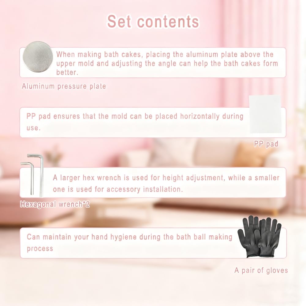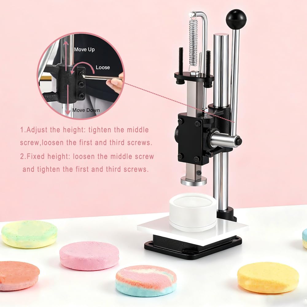 ملحوظة: آلة ضغط كرات ملح الاستحمام هذه هي آلة شديدة التحمل، ويوجد زيت تشحيم في الأجزاء المتحركة من الجسم، وهو أمر طبيعي بالنسبة للآلة. يرجى ملاحظة أن هذه ليست مشكلة في الجهاز. يرجى أيضًا الانتباه إلى السلامة عند ضبط الارتفاع وتجنب سحق يديك