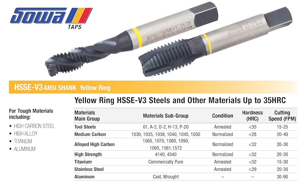 أداة Sowa Tool M30 x 3.5mm حنفية لولبية - HSSE-V3، حلقة صفراء، خيط متري، أداء عالي للسبائك والفولاذ المقاوم للصدأ، صنبور آلي للفتحات