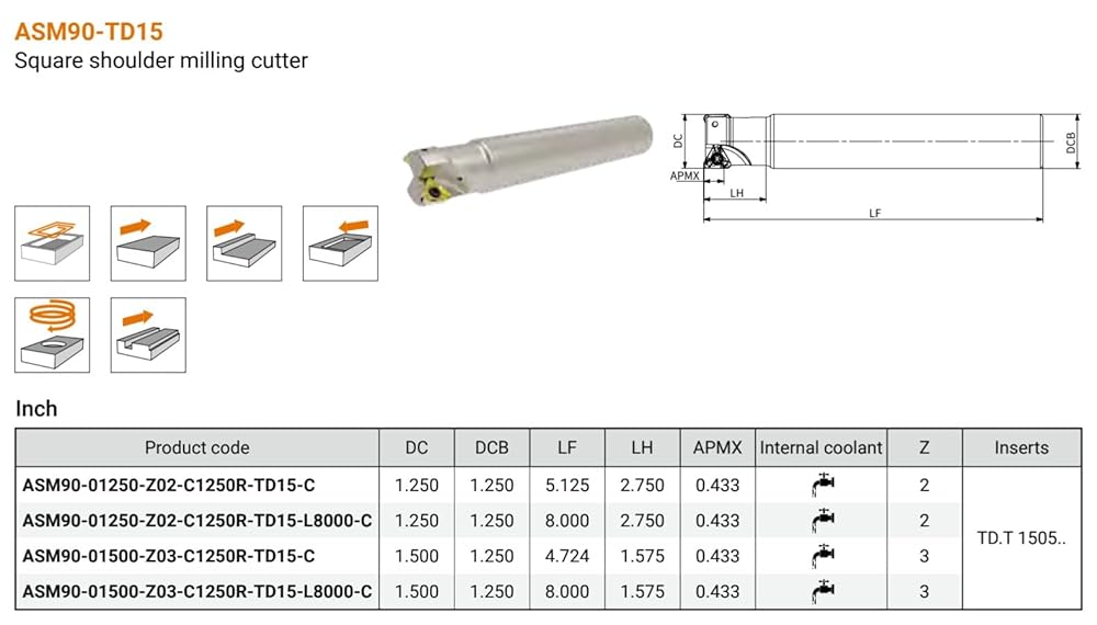 ASM90-01500-Z03-C1250R-TD15-L8000-C 1.50 بوصة ضياء. مطحنة نهاية قابلة للفهرسة 90 درجة الرصاص. 3 أسنان مع 3 حواف قطع 8.00 OAL
