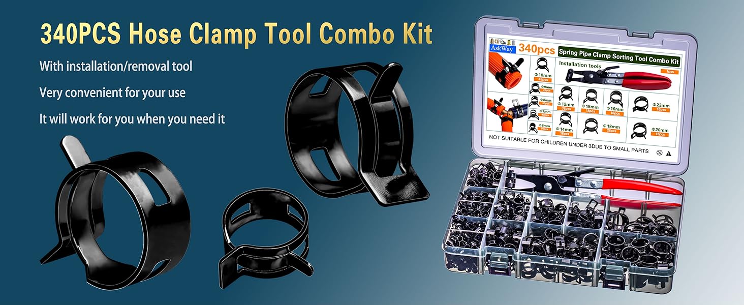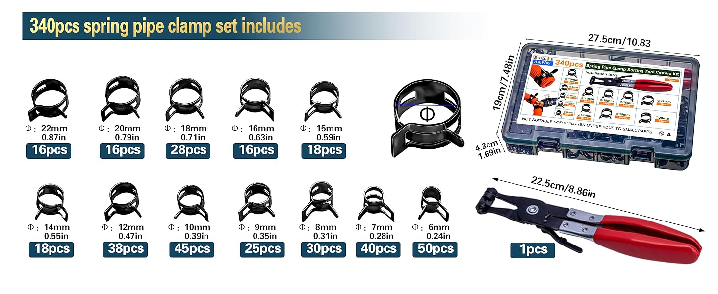 【ما ستحصل عليه】في هذه المجموعة، ستحصل على قطعة واحدة من أداة تركيب مشبك خرطوم زنبركي، 340 قطعة و12 مقاسًا مختلفًا من مشابك خرطوم زنبركية، بما في ذلك 6 مم؛ 7 مللي متر ؛ 8 مللي متر ؛ 9 ملم؛ 10 ملم؛ 12 ملم؛ 14 ملم؛ 15 ملم؛ 16 ملم؛ 18 ملم؛ 20 ملم؛ مجموعة أدوات مشبك خرطوم زنبركي مقاس 22 مم يمكن أن تلبي جميع احتياجاتك اليومية. يتم تخزينها في صناديق تخزين، مما يسهل عليك فرزها وإخراجها للاستخدام.