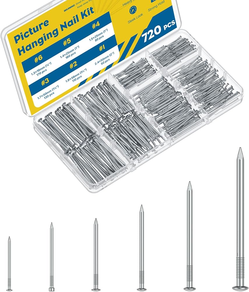 مسامير حائط متعددة الأغراض: قم بتحويل أي مساحة إلى معرض شخصي خاص بك! هذه الأظافر النهائية مثالية لتعليق الصور واللوحات والقماش والمرايا والساعات والتقويمات وديكور المنزل. تحافظ حقيبة التخزين الذكية على ترتيب جميع الأحجام وسهولة الوصول إليها