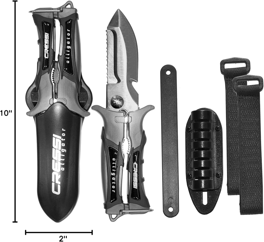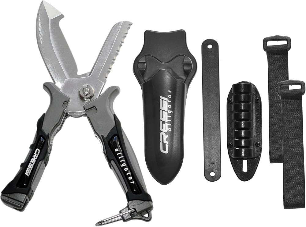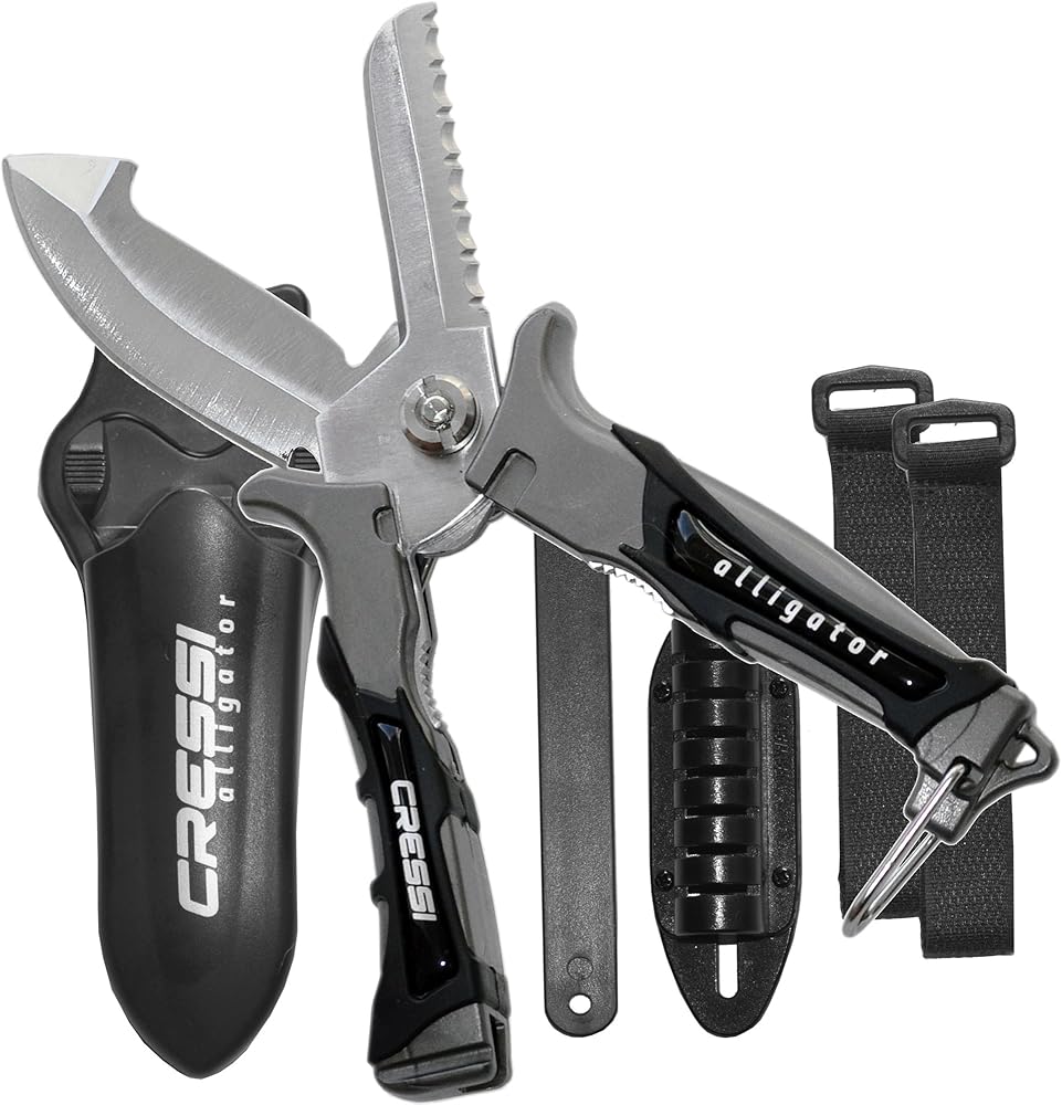 Knife-scissors are very practical for all types of operations underwater. Made of high-strength stainless steel, it is useful as scissors, as a knife with a smooth edge, as a saw, and also has a useful recess as a wire cutter. Includes serration for use as pliers. With respect to other similar knives, it has the advantage of its compact size and its full use and ergonomics without having to open it to cut efficiently, using it as a knife. Great cutting capacity and resistance to oxidation. The Alligator is designed by Cressi and made in Taiwan. Cressi has been an Italian brand pioneer in scuba diving, snorkeling, and spearfishing equipment. The product is covered by a 2-year limited warranty.