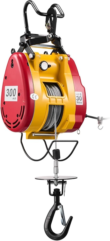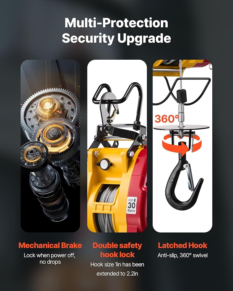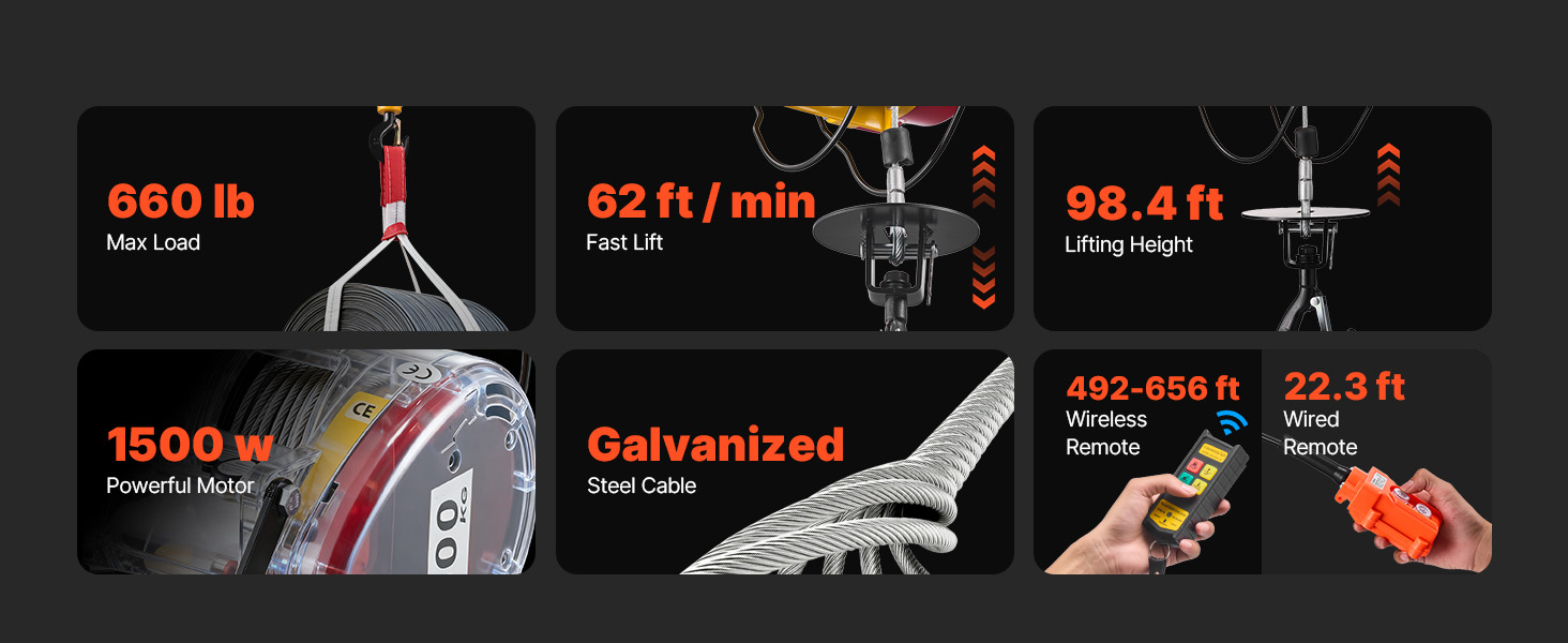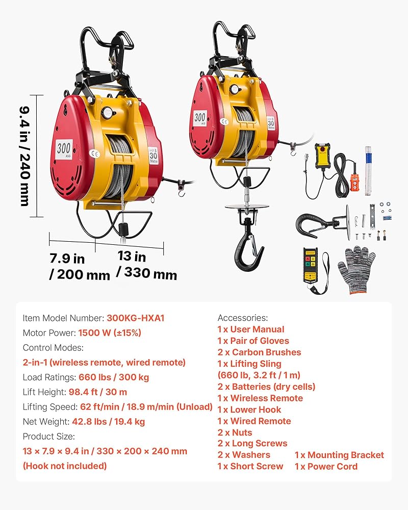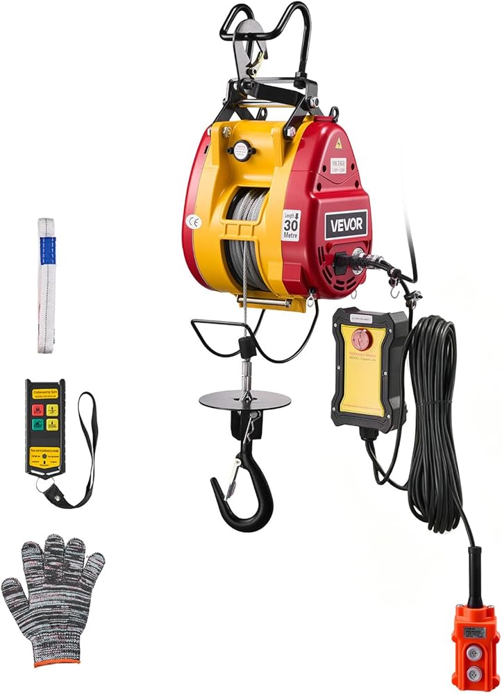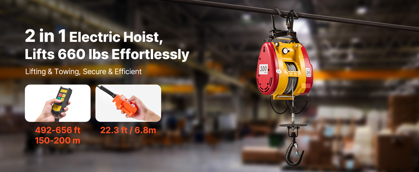 VEVOR 2 في 1 رافعة كهربائية، سعة 660 رطل، رافعة ونش طاقة محمولة 1500 وات، ارتفاع رفع 98.4 قدم، 62 قدم/دقيقة مع جهاز تحكم عن بعد سلكي ولاسلكي للمصنع والمستودع والمرآب