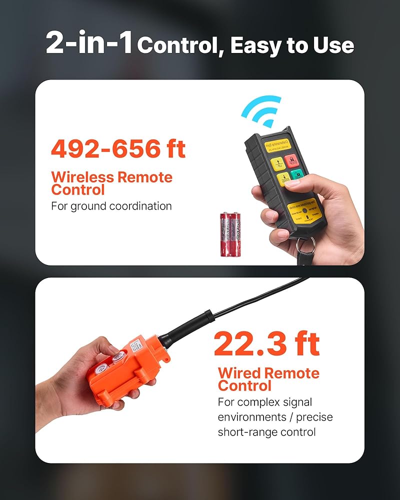 • تحكم سهل 2 في 1: تتعامل هذه الرافعة الكهربائية الكهربائية مع الرفع الرأسي والسحب الأفقي في وحدة واحدة. يوفر جهاز التحكم عن بعد السلكي بطول 22.3 قدمًا تحكمًا دقيقًا عن قرب، ويدعم جهاز التحكم عن بعد اللاسلكي بطول 492-656 قدمًا العمل الجماعي المتنقل