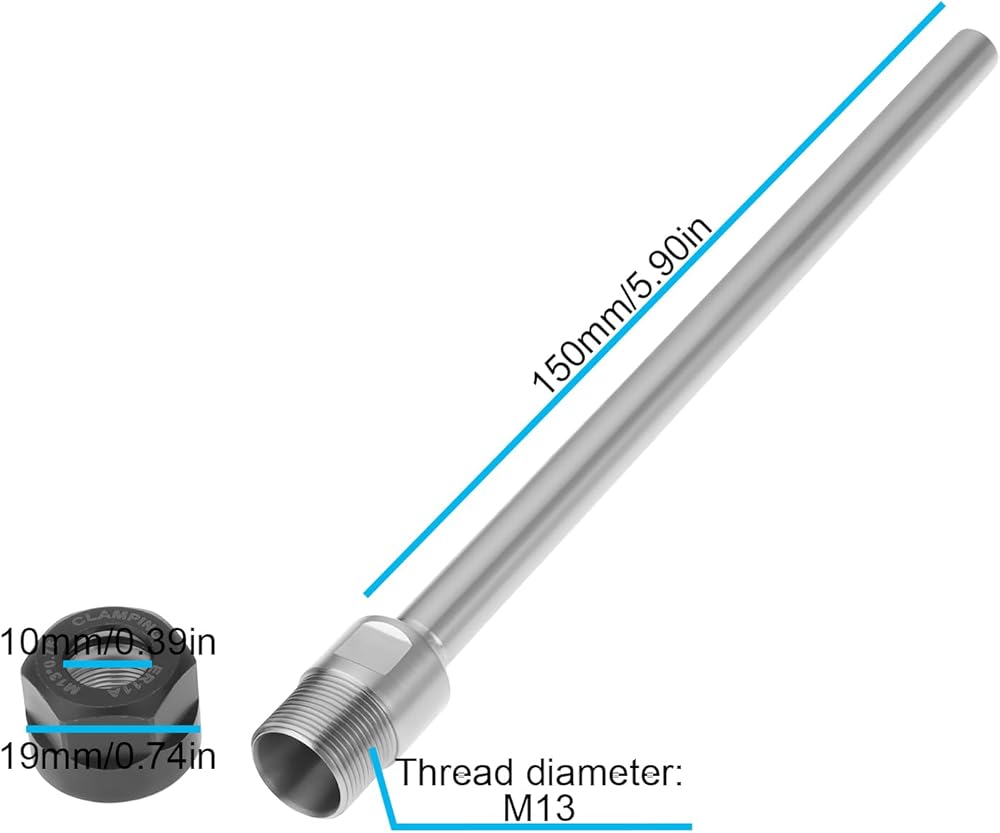 الأبعاد: طول القضيب 150 مم، قطر الخيط M13، فتحة محول كوليت 10 مم، القطر الخارجي 19 مم، القياس اليدوي، يرجى السماح بأخطاء طفيفة.