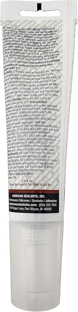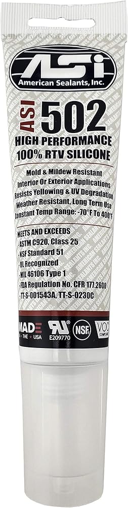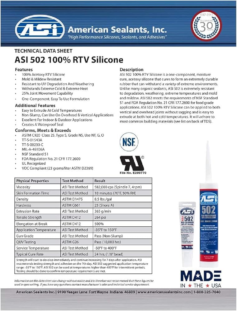 ASI 502 عبارة عن سيليكون RTV بنسبة 100% ومعترف به من UL وNSF. ASI 502 عبارة عن سيليكون RTV (كبريت بدرجة حرارة الغرفة) مكون من جزء واحد يعالج بمطاط السيليكون القوي الذي يحافظ على المتانة والمرونة على المدى الطويل. ASI 502 100% RTV Silicone عبارة عن مادة مانعة للتسرب ويمكن تطبيقها على الأسطح الرأسية أو العلوية دون التدفق أو الترهل. نظرًا لأن ASI 502 عبارة عن مادة مانعة للتسرب من السيليكون RTV بنسبة 100%، فإنها تتمتع بمقاومة ممتازة للعوامل الجوية بما في ذلك الأوزون والأشعة فوق البنفسجية وظروف التجميد والذوبان والمواد الكيميائية المحمولة بالهواء. يتمتع ASI 502، المعالج بالكامل، بقدرة التصاق ممتازة على الزجاج والمعادن والخزف والسيراميك والخشب ومعظم المواد البلاستيكية والعديد من الركائز غير المسامية الأخرى. يمكن تطبيق سيليكون RTV بنسبة 100% من ASI (ASI 502) على درجات حرارة السطح من -18 درجة مئوية إلى +50 درجة مئوية (0 درجة فهرنهايت إلى +120 درجة فهرنهايت) وبعد المعالجة، يتحمل درجات حرارة التشغيل الثابتة من -70 إلى +400 درجة فهرنهايت. الاستخدامات النموذجية: ASI 502 هو مادة مانعة للتسرب و/أو مادة لاصقة ممتازة للعديد من التطبيقات التي تتطلب استخدامًا طويل الأمد. ، مطلوب رابطة أو ختم مرن بشكل دائم.