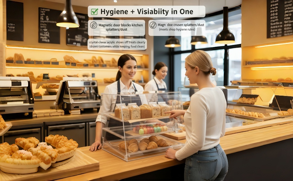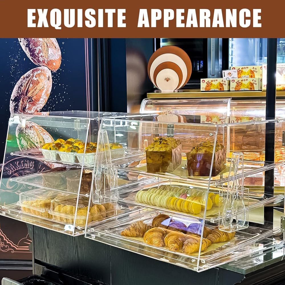 رؤية واضحة: هيكل أكريليك ممتاز يوفر رؤية 360 درجة للمنتجات المعروضة، مثالي لعرض السلع المخبوزة