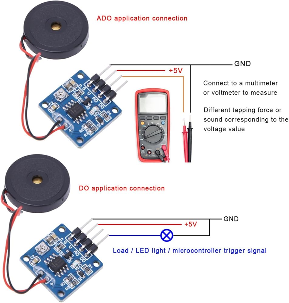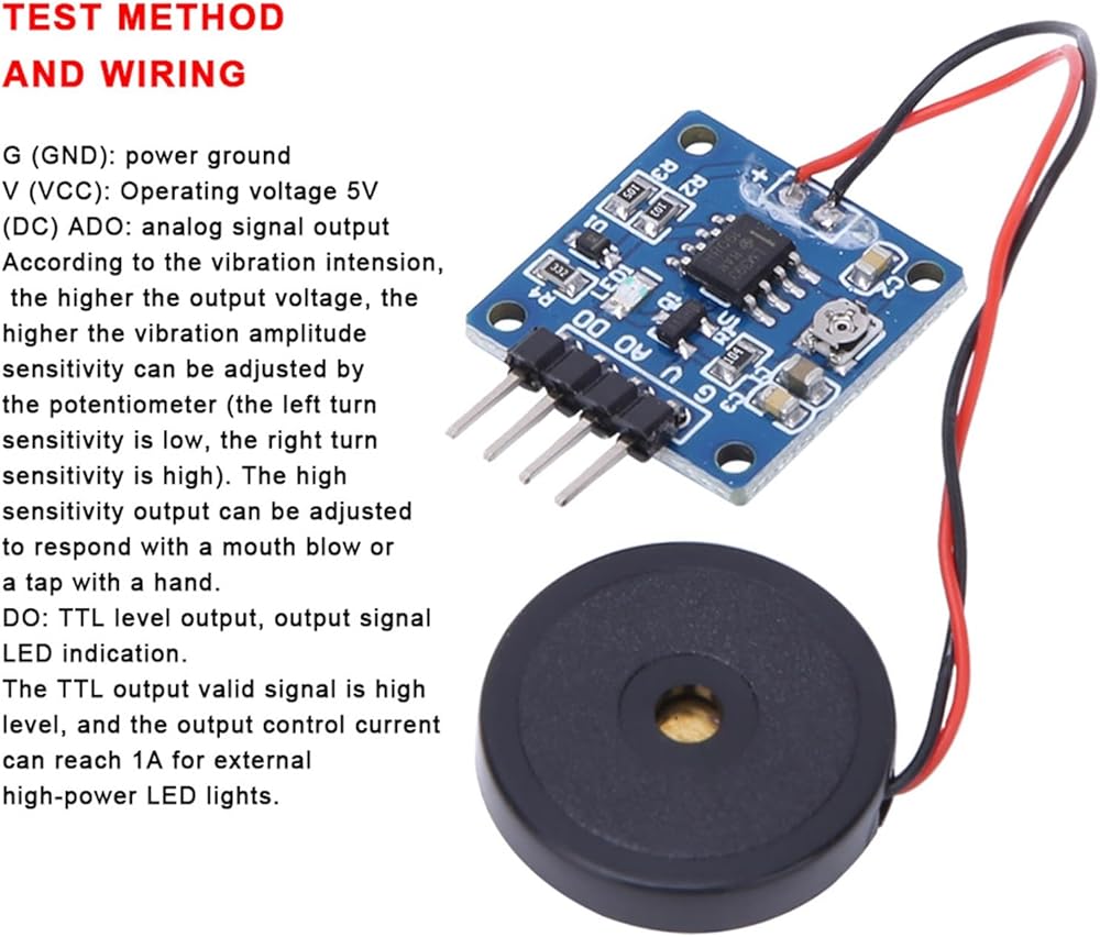According to the vibration intension, the higher the output voltage, the higher the vibration amplitude sensitivity can be adjusted by the potentiometer (the left turn sensitivity is low, the right turn sensitivity is high). The high sensitivity output can be adjusted to respond with a mouth blow or a tap with a hand.