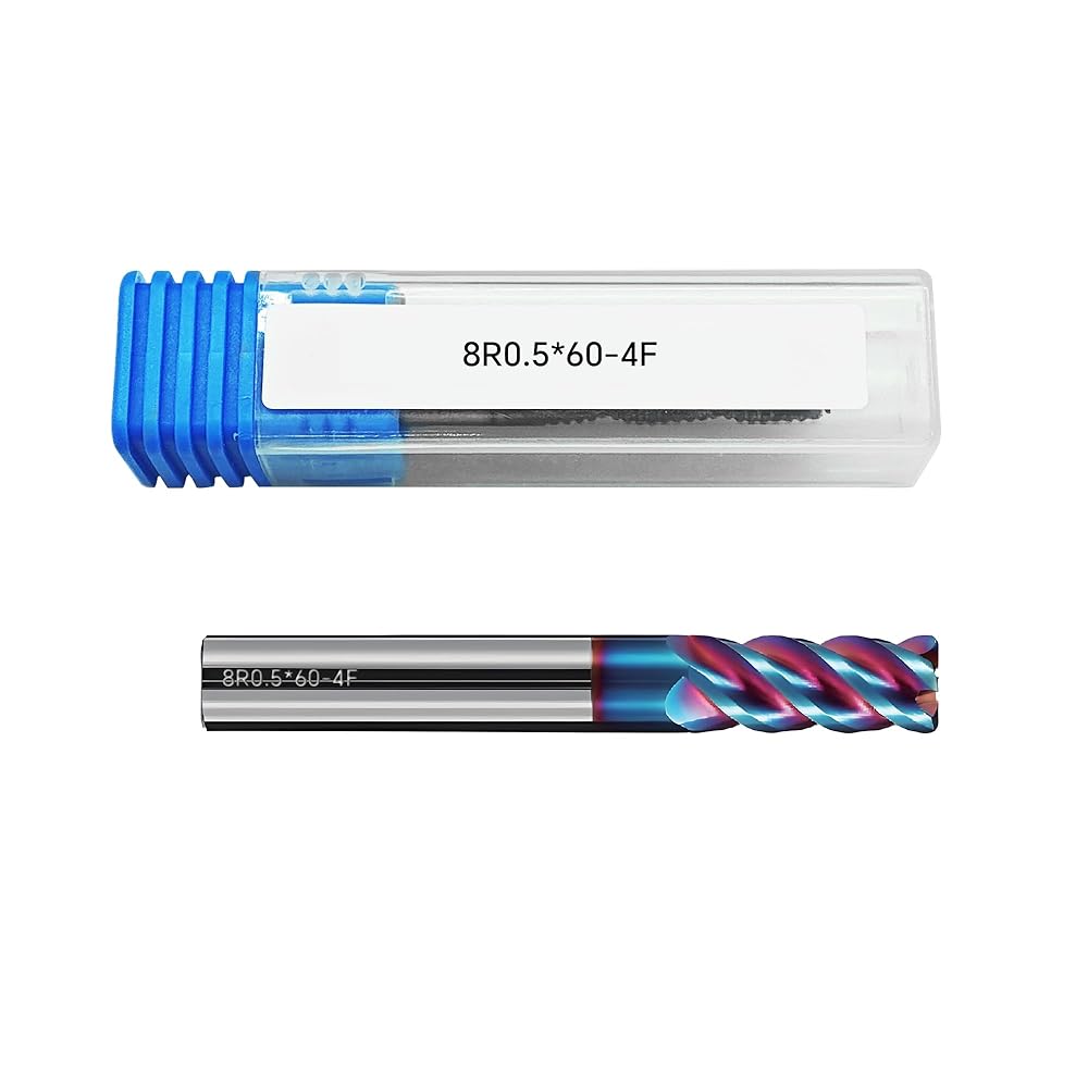 Rayjee مطحنة نهاية نصف قطرها كربيد الحبوب الدقيقة المطلية بالنانو، 4 تصميم مسطح فلوت، نصف قطر زاوية R0.5، كربيد CM124 مع 12% كوبالت، 8*20*8*60 مم، قاطع طحن CNC للحديد الزهر الفولاذي حتى HRC58