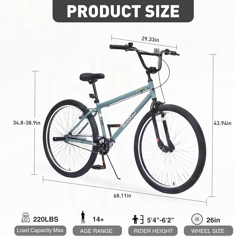• الإطار: فولاذ عالي الكربون، 15 بوصة <br><br> العجلات: إطارات ألومنيوم 26 بوصة <br><br> الإطارات: 26 بوصة × 2.35 بوصة هوائية، لجميع التضاريس <br><br> المكابح: قرص أمامي + فرامل على شكل حرف V خلفية <br><br> السرعة: سرعة واحدة <br><br> السرج: ارتفاع قابل للتعديل، جلد PU مع رغوة الذاكرة <br><br> المقابض: سيليكون ناعم، مضاد للانزلاق <br><br> التجميع: 98% مثبت مسبقًا