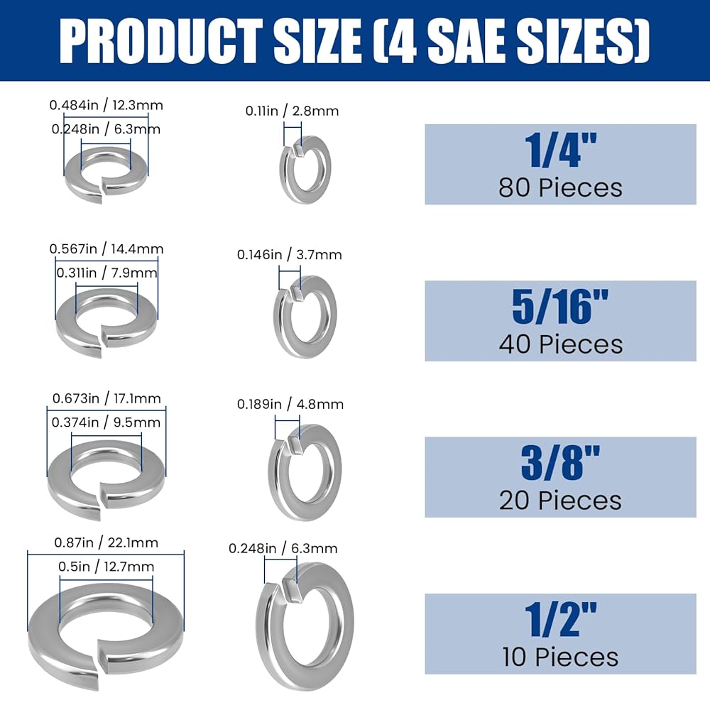ستحصل على 150 قطعة من حلقات القفل المقسمة في 4 أحجام شائعة الاستخدام لتغطية الاحتياجات المتنوعة: 80 قطعة مقاس 1/4 بوصة، 40 قطعة مقاس 5/16 بوصة، 20 قطعة مقاس 3/8 بوصة، و 10 قطع بحجم 1/2 بوصة إنه يوفر الكمية المناسبة لكل من مهام الأعمال اليدوية الصغيرة وأعمال الصيانة المنتظمة