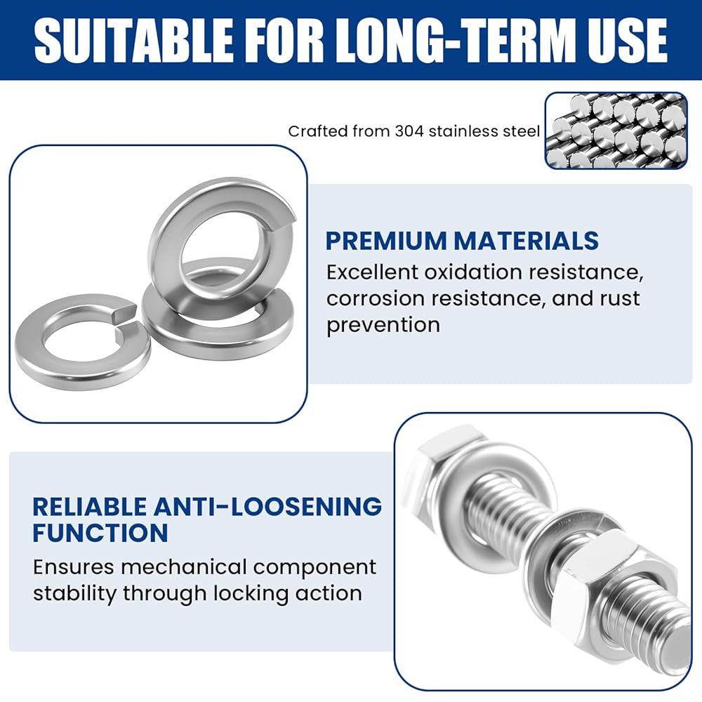 𝐇𝐢𝐠𝐡 𝐐𝐮𝐚𝐥𝐢𝐭𝐲: مصنوعة من الفولاذ المقاوم للصدأ 304، تتميز هذه الغسالات ذات القفل المقسم بقوة عالية ومتانة ممتازة. إنها توفر مقاومة قوية للأكسدة، ومقاومة للتآكل، ومقاومة للصدأ - وهي مثالية للاستخدام طويل الأمد في بيئات مختلفة