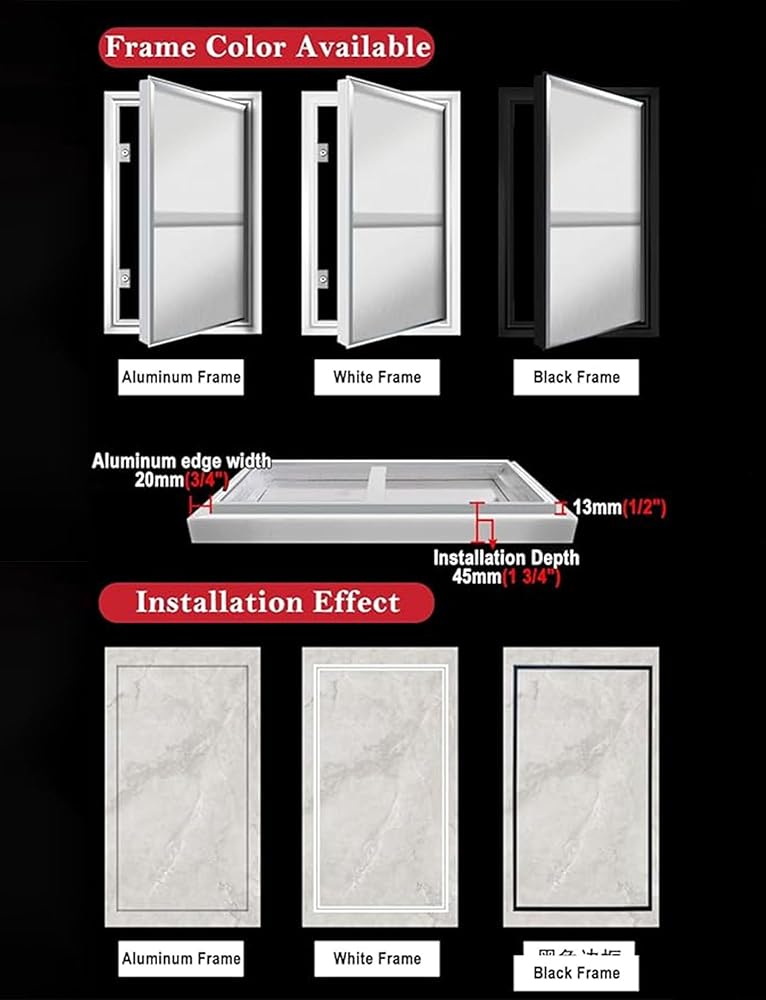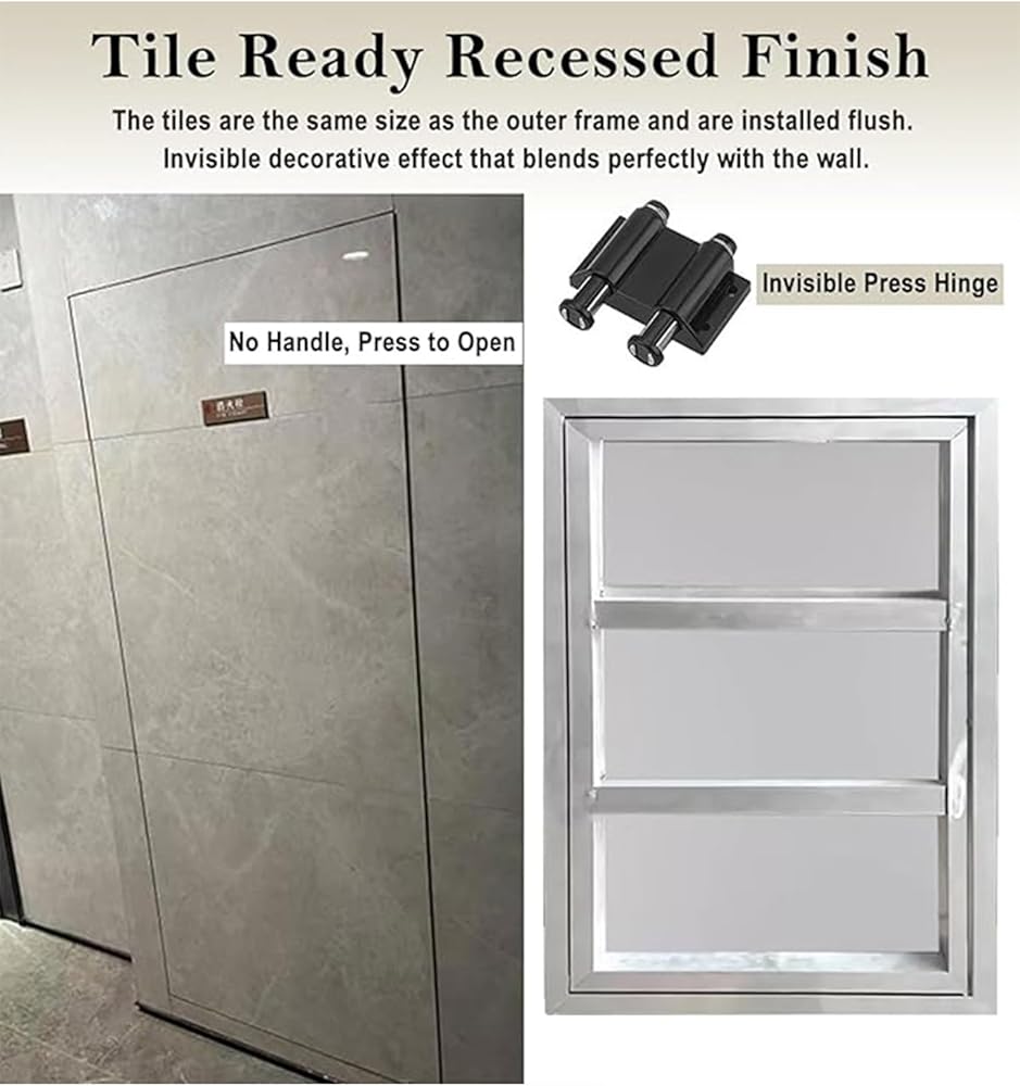 • فتحة وصول مخفية: يتميز باب الوصول المبتكر هذا بمزلاج ومفصلات مخفية تعمل باللمس، مما يضمن سهولة الدخول مع الحفاظ على المظهر الأنيق. مثالي للوحات الوصول إلى الحوائط الجافة، فهو يبسط مهام الإصلاح الخاصة بك ويعزز جماليات المساحة الخاصة بك، مما يجعله خيارًا مثاليًا لأصحاب المنازل والمقاولين على حد سواء.