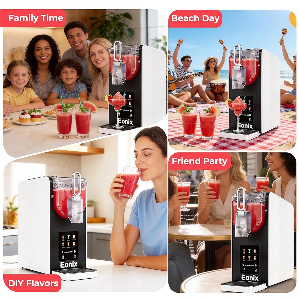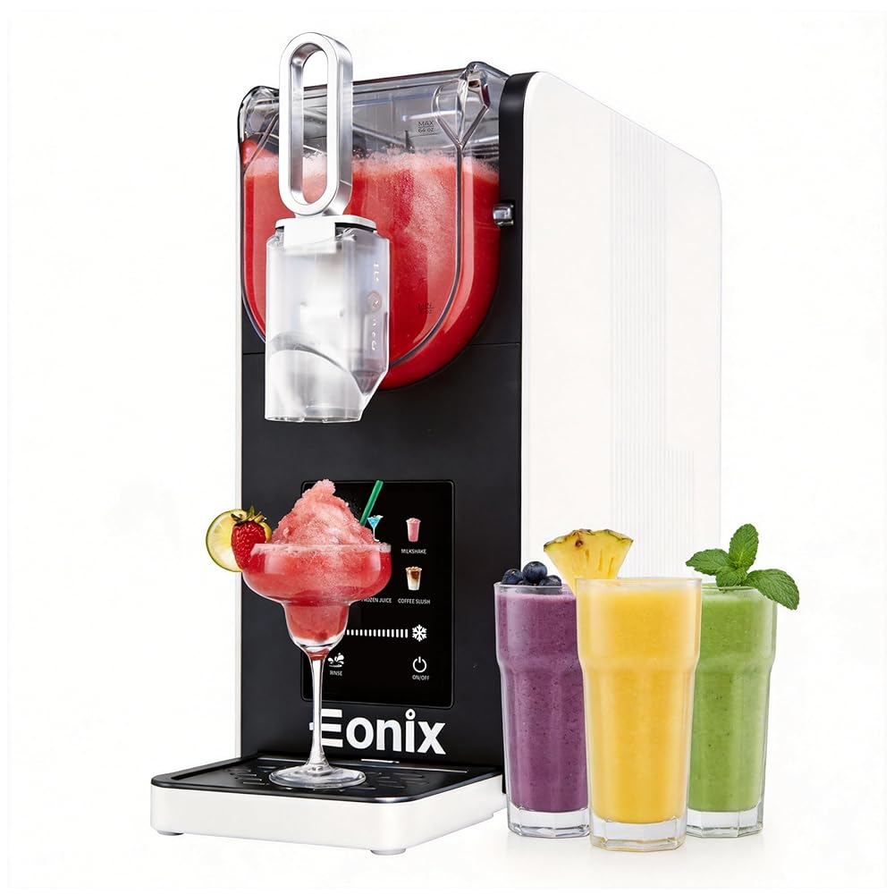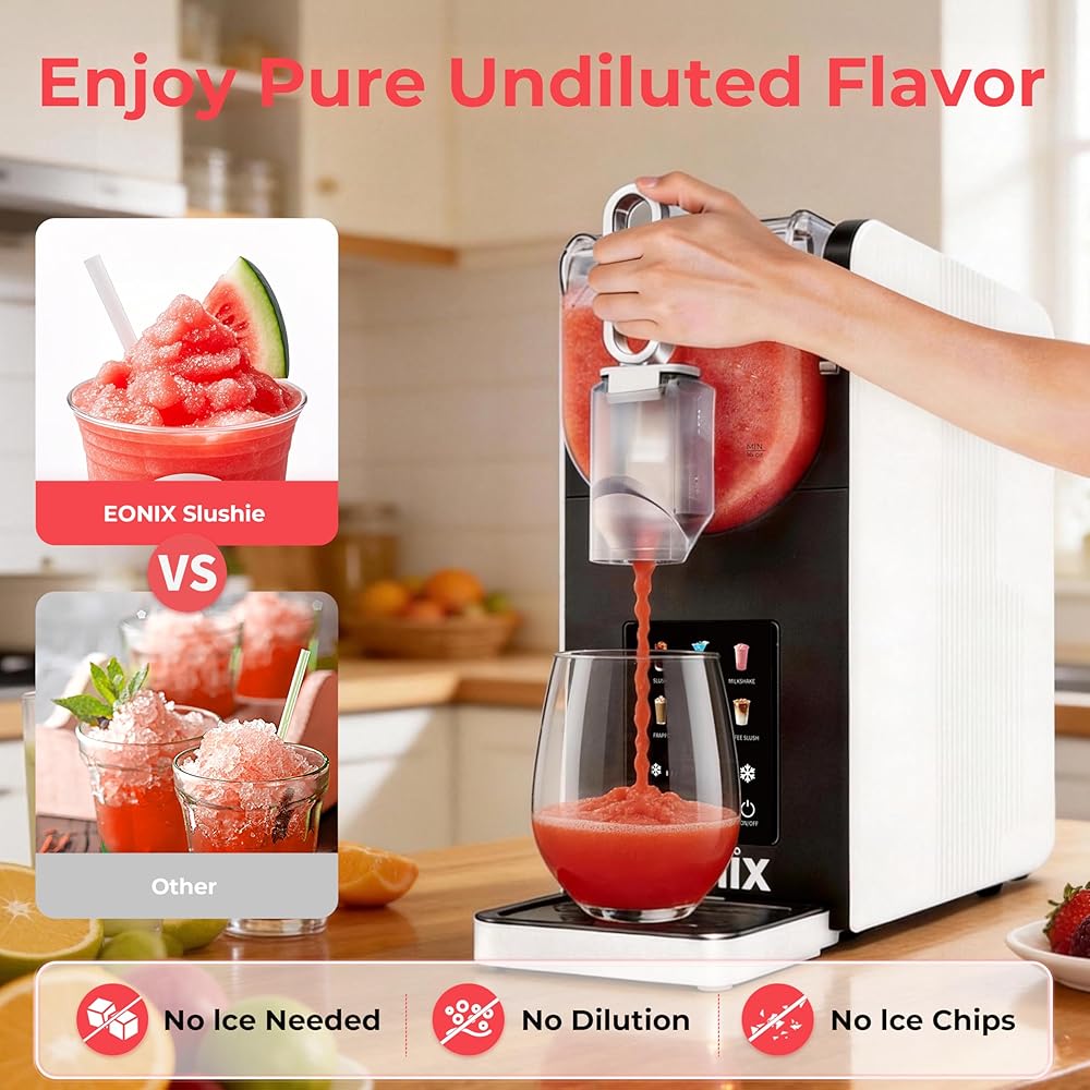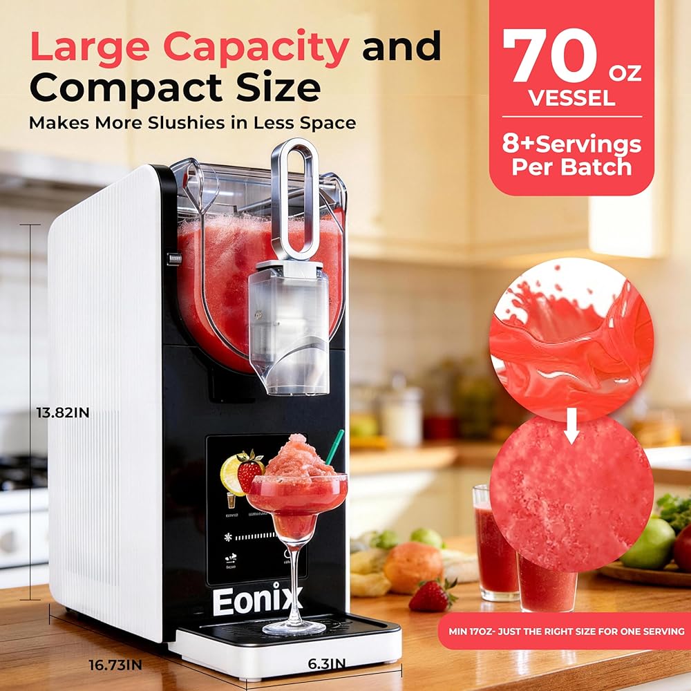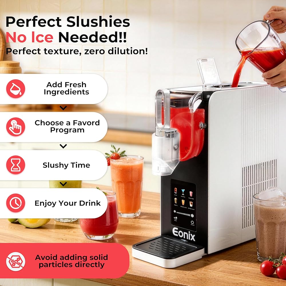 🍧(لا حاجة للثلج والتجميد السريع) تعمل آلة سلاشي EONIX على التخلص من متاعب إضافة مكعبات الثلج. إنها تدور البريمة حول أسطوانة التبريد لتجميد السائل بالتساوي والحفاظ على درجة الحرارة المثالية للحصول على حلوى ثلجية مثالية. تقنية التجميد السريع من EONIX تحافظ على نضارة الفواكه والمشروبات الروحية والقواعد الكريمية في 15-60 دقيقة. لا يوجد تجميد مسبق، لا مزج، فقط متعة مجمدة سريعة وسهلة.