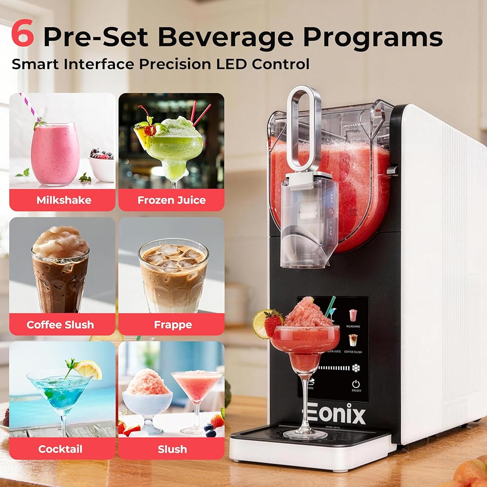 🧁【6 برامج محددة مسبقًا】 وضع الاختيار بلمسة واحدة، ومن خلال الأزرار الموجودة على شاشة LED تجعل من السهل إنشاء مشروباتك المفضلة. تتميز بشفرات خلط دوارة بزاوية 360 درجة تعمل على تجميد السوائل بالتساوي للحصول على ملمس ناعم تمامًا. من خلال التشغيل البسيط، يمكنك بسهولة إنشاء مجموعة متنوعة من المشروبات الكحولية وغير الكحولية، من الكوكتيل إلى السلاش والميلك شيك والعصير المجمد والفرابيه والقهوة سلاش. آلة مشروبات مجمدة تناسب يومك بالكامل.