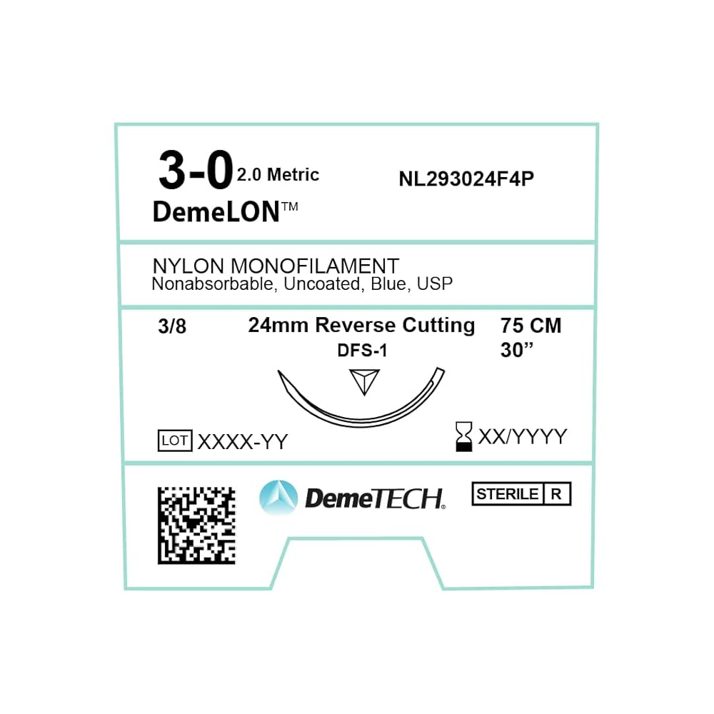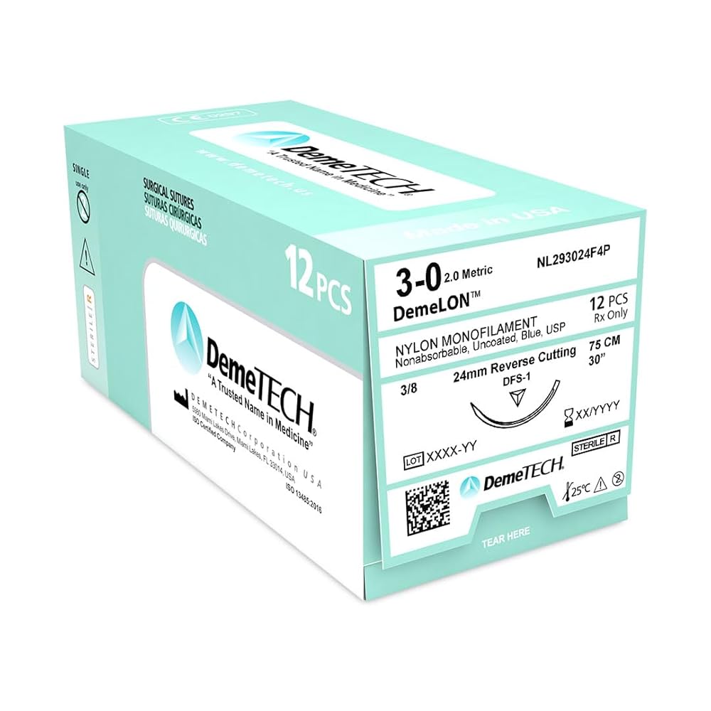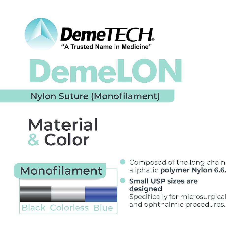 خياطة النايلون غير القابلة للامتصاص: خياطة النايلون الخاصة بشركة DemeTECH هي خياطة جراحية معقمة وغير قابلة للامتصاص وتتكون من سلسلة طويلة من البوليمر الأليفاتي نايلون 6.6. خيوط النايلون الخاصة بشركة DemeTECH متوفرة باللون الأسود أو الأزرق، مصبوغة بصبغة (صبغات) مدرجة في قائمة إدارة الغذاء والدواء. عادة ما يتبع هذه العملية تغليف تدريجي للخياطة بواسطة النسيج الضام الليفي.