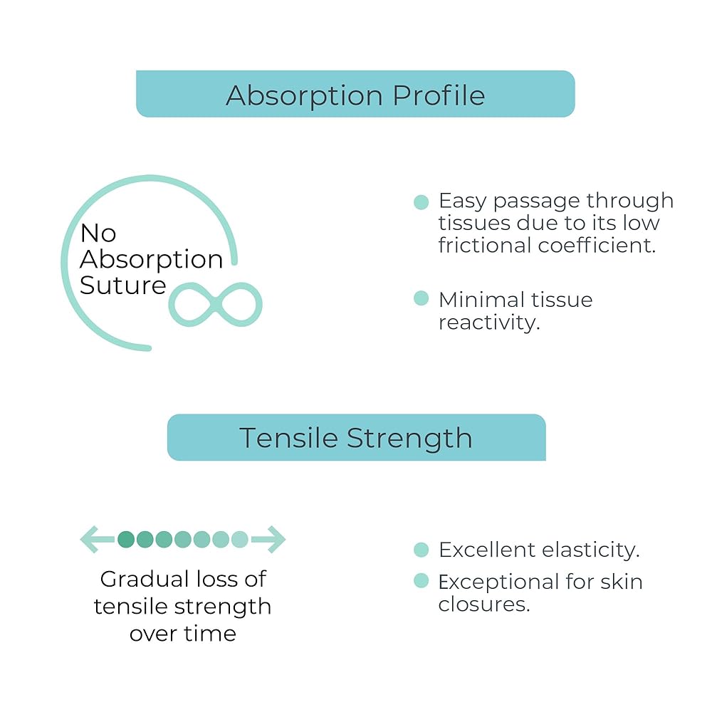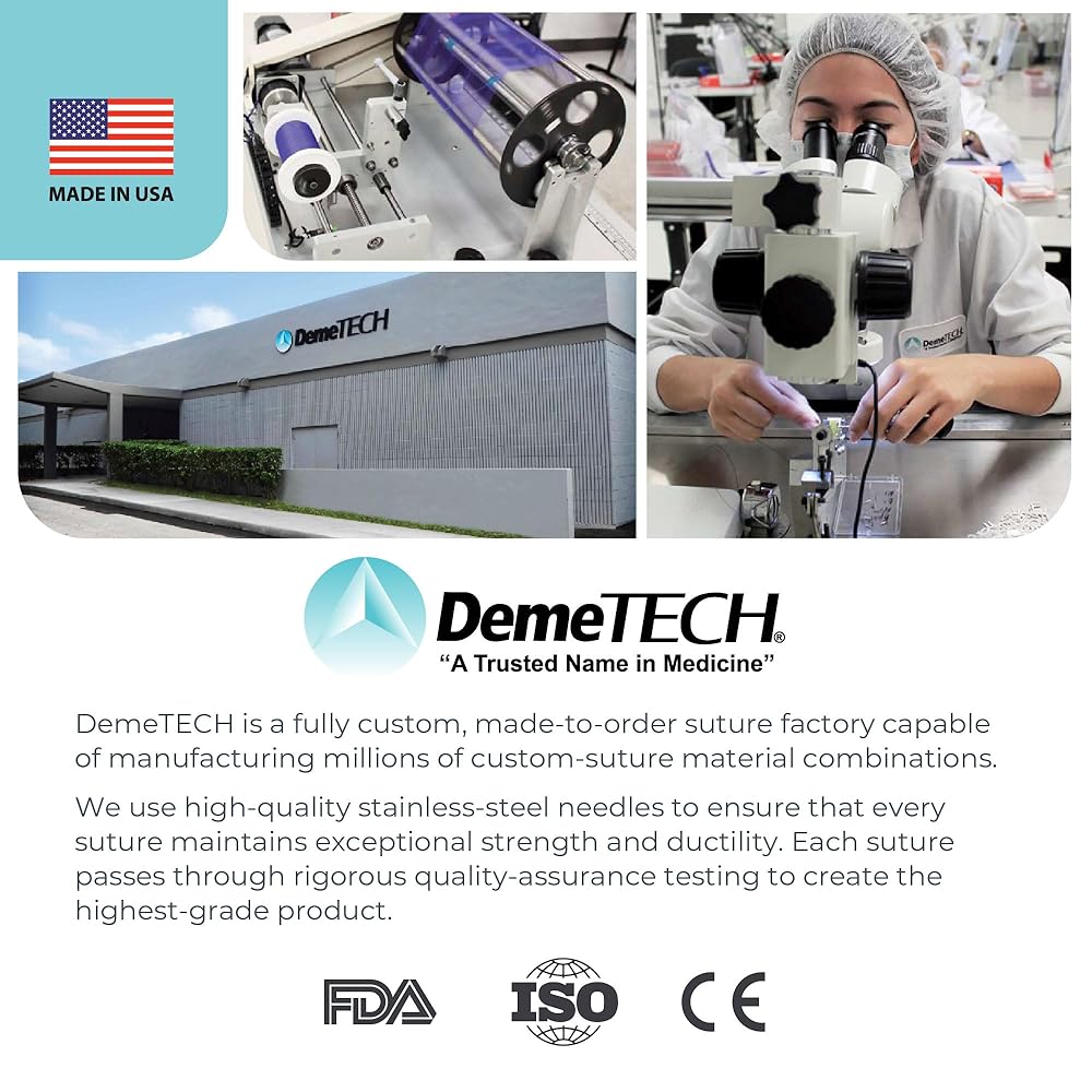 مستلزمات خياطة عالية الجودة مصنوعة في الولايات المتحدة الأمريكية: تلبي خيوط النايلون الأحادية هذه جميع المتطلبات التي وضعها دستور الأدوية الأمريكي (USP) للخيوط الجراحية غير القابلة للامتصاص. تمر كل مجموعة خياطة وإبرة من DemeTECH عبر اختبارات صارمة لضمان الجودة للتأكد من أن كل خياطة تحافظ على قوة وليونة استثنائية.