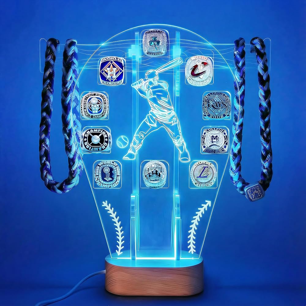 حامل حلقة بيسبول مضيء ومذهل: يتميز حامل حلقة البيسبول الفاخر هذا بتصميم مضيء فريد يخلق تأثيرًا ثلاثي الأبعاد مذهلاً مع نقوش ليزر، مما يجعله أكثر من مجرد حامل حلقة - فهو يعمل كإضاءة ليلية لافتة للنظر. تعمل إضاءة LED النابضة بالحياة على تحويل أي غرفة، مما يضيف لمسة ديناميكية وحديثة أثناء عرض حلقات البطولة الثمينة الخاصة بك بأناقة.