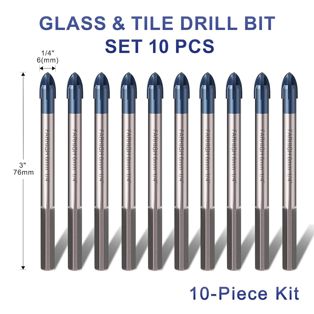 مجموعة لقم مثقاب الزجاج والبلاط، لقمة مثقاب مائلة من كربيد Ti وTungsten، 6 مم (1/4 بوصة)، 10 عبوات، للزجاج والبلاط والسيراميك والبورسلين والخرسانة