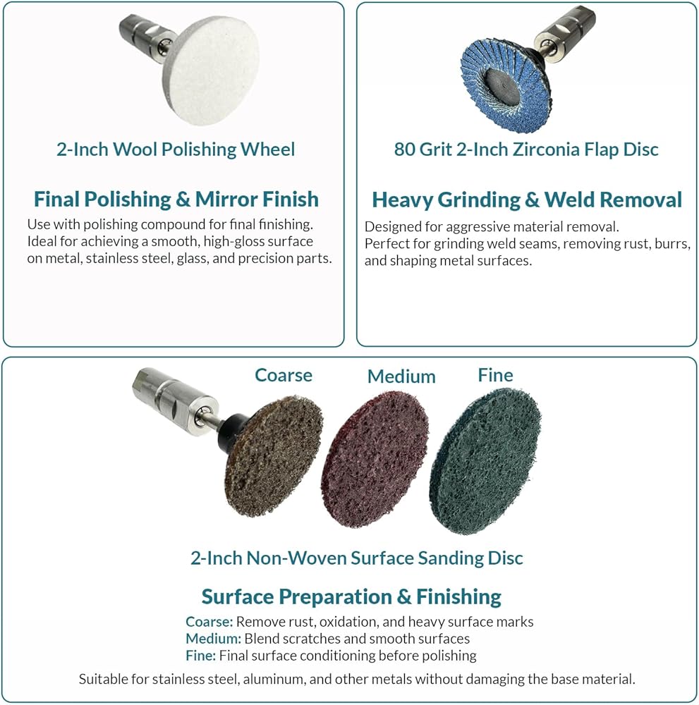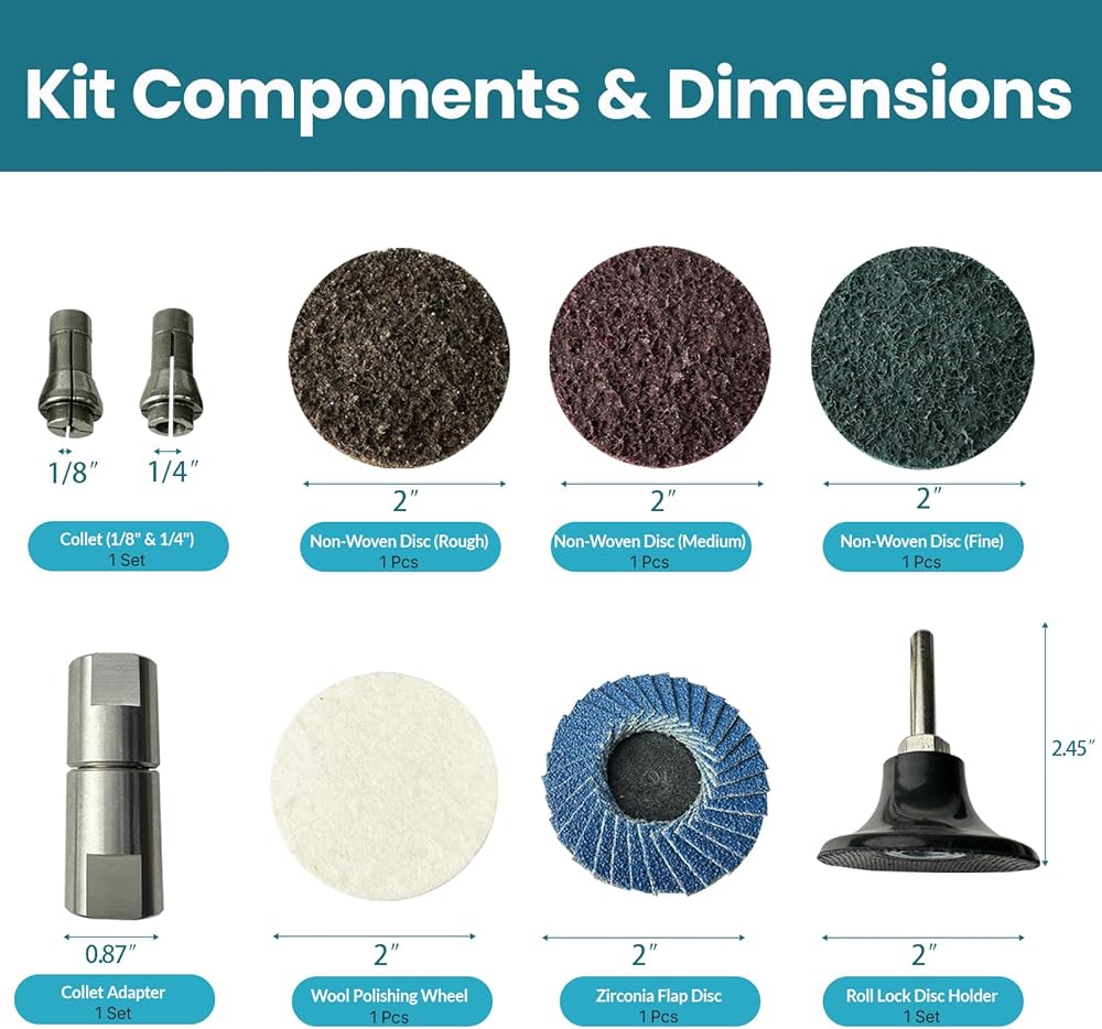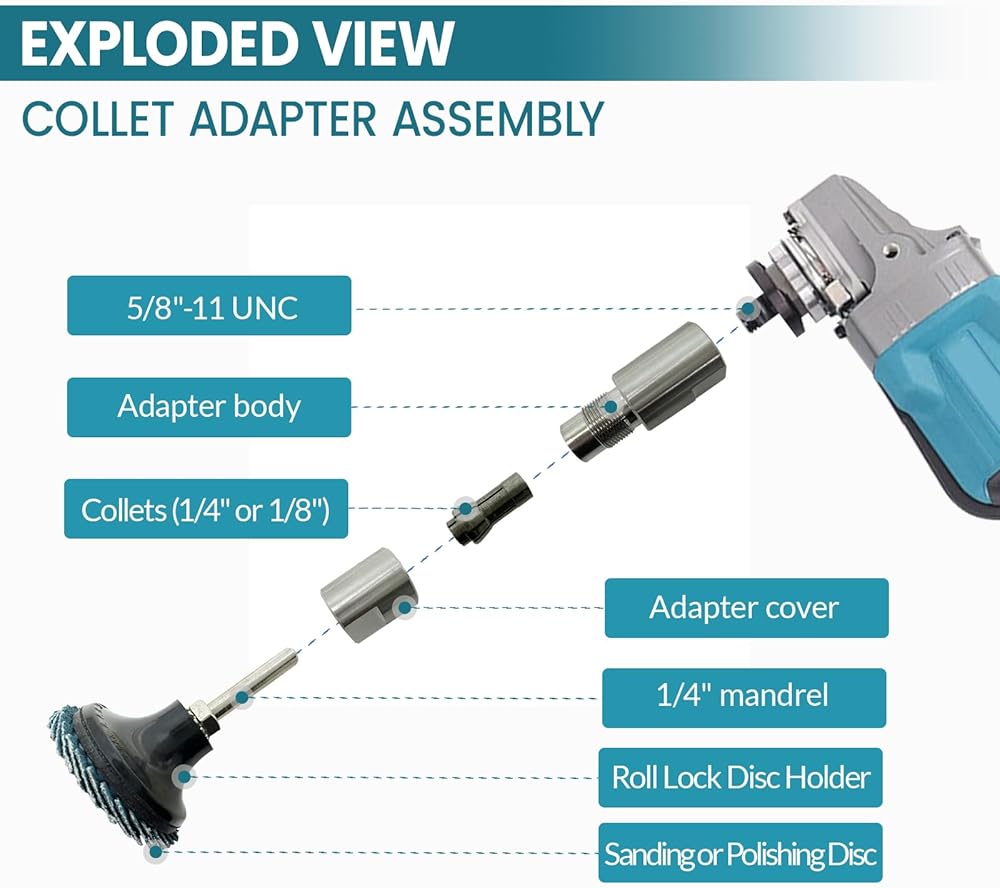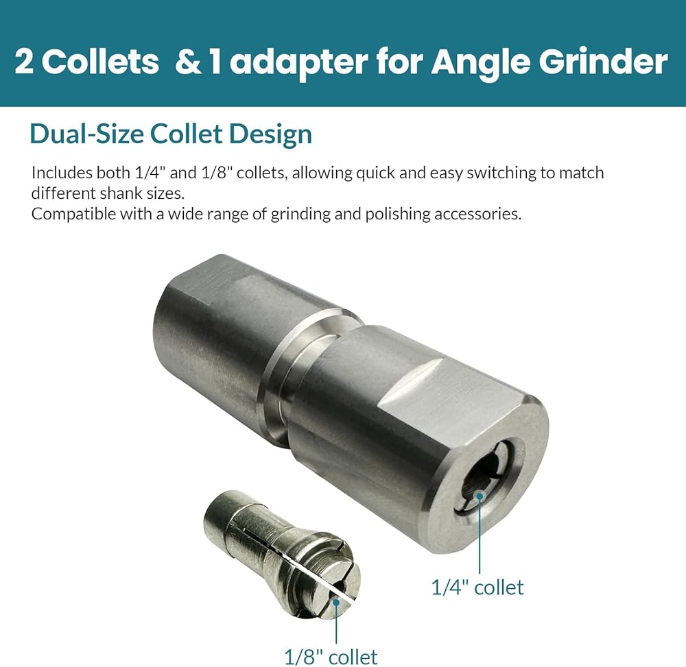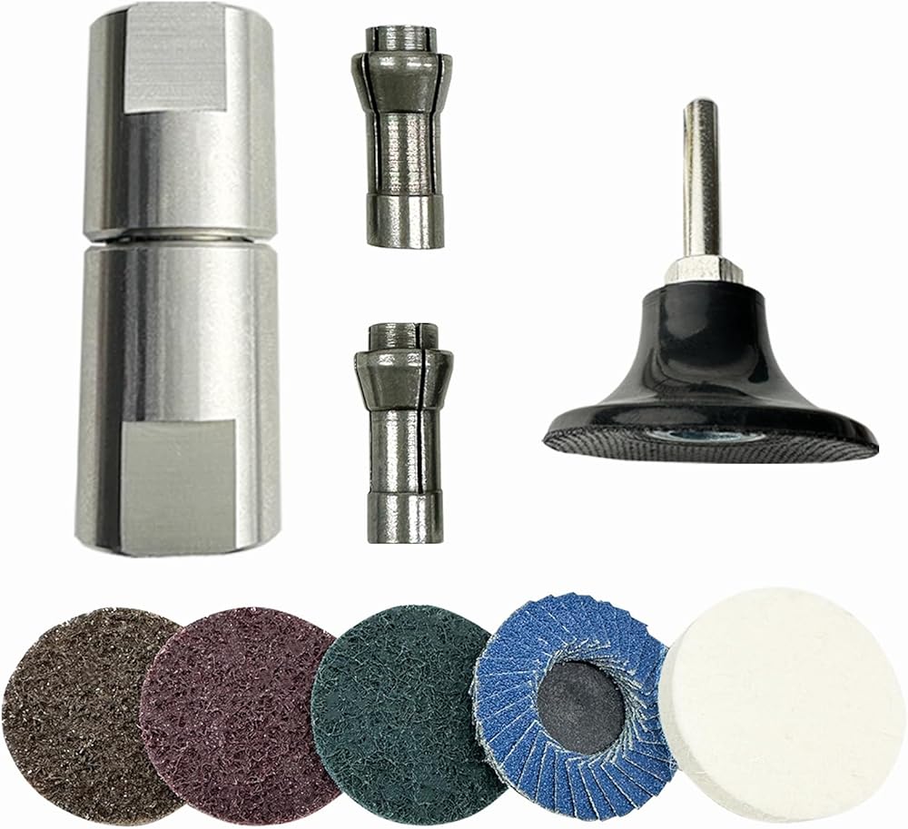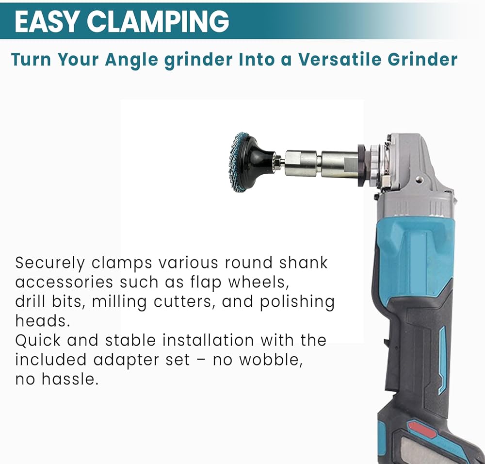 Multi-Function Heavy-Duty Conversion Adapter This multi-function heavy-duty conversion adapter features a standard 5/8"-11 thread for quick and easy installation. It allows an angle grinder to be converted into a die grinder, expanding its use for grinding, deburring, engraving, and polishing applications. The adapter is made from premium stainless steel, providing excellent wear resistance and corrosion resistance for extended service life. The solid construction supports stable performance during high-speed operation. The kit includes 1/4" and 1/8" high-precision collets, designed to withstand increased working pressure and help maintain consistent performance during detailed and efficient grinding and polishing tasks. This set comes with one quick-change disc backing pad and five types of high-quality sanding and polishing discs in different hardness levels, ranging from wool polishing discs to non-woven surface conditioning discs. These attachments are suitable for a variety of surface finishing needs. The twist-on quick-change design allows for fast attachment and removal, improving overall work efficiency. Compatible with angle grinders, rotary tools, and electric drills, this adapter kit is widely used in automotive applications, metalworking, woodworking, and furniture fabrication, supporting tasks such as grinding, deburring, engraving, polishing, and general surface preparation.