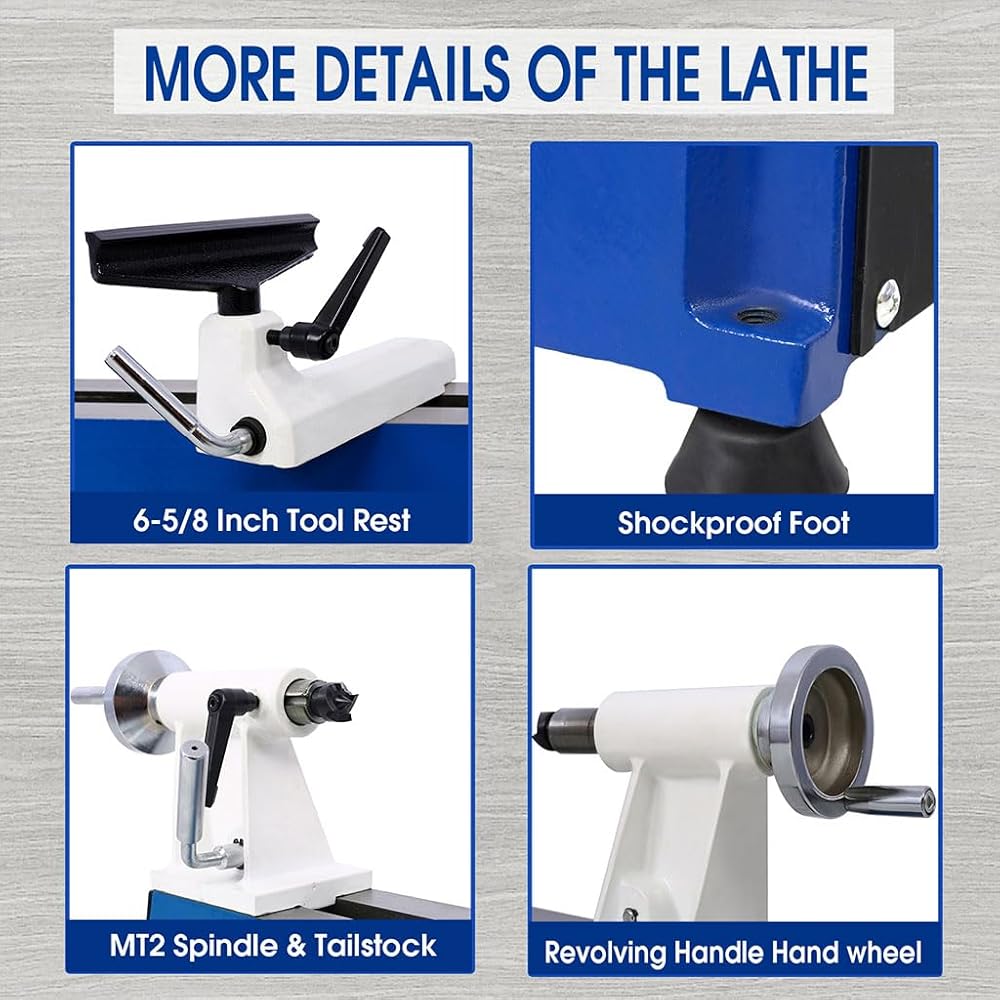 Powerful Performance: Equipped with a reliable 1/2 HP 110V 60HZ pure copper motor for effortless turning, featuring spindle threads measuring 1 inch by 8 TPI, MT2 headstock spur center and MT2 tailstock live center for added convenience.
