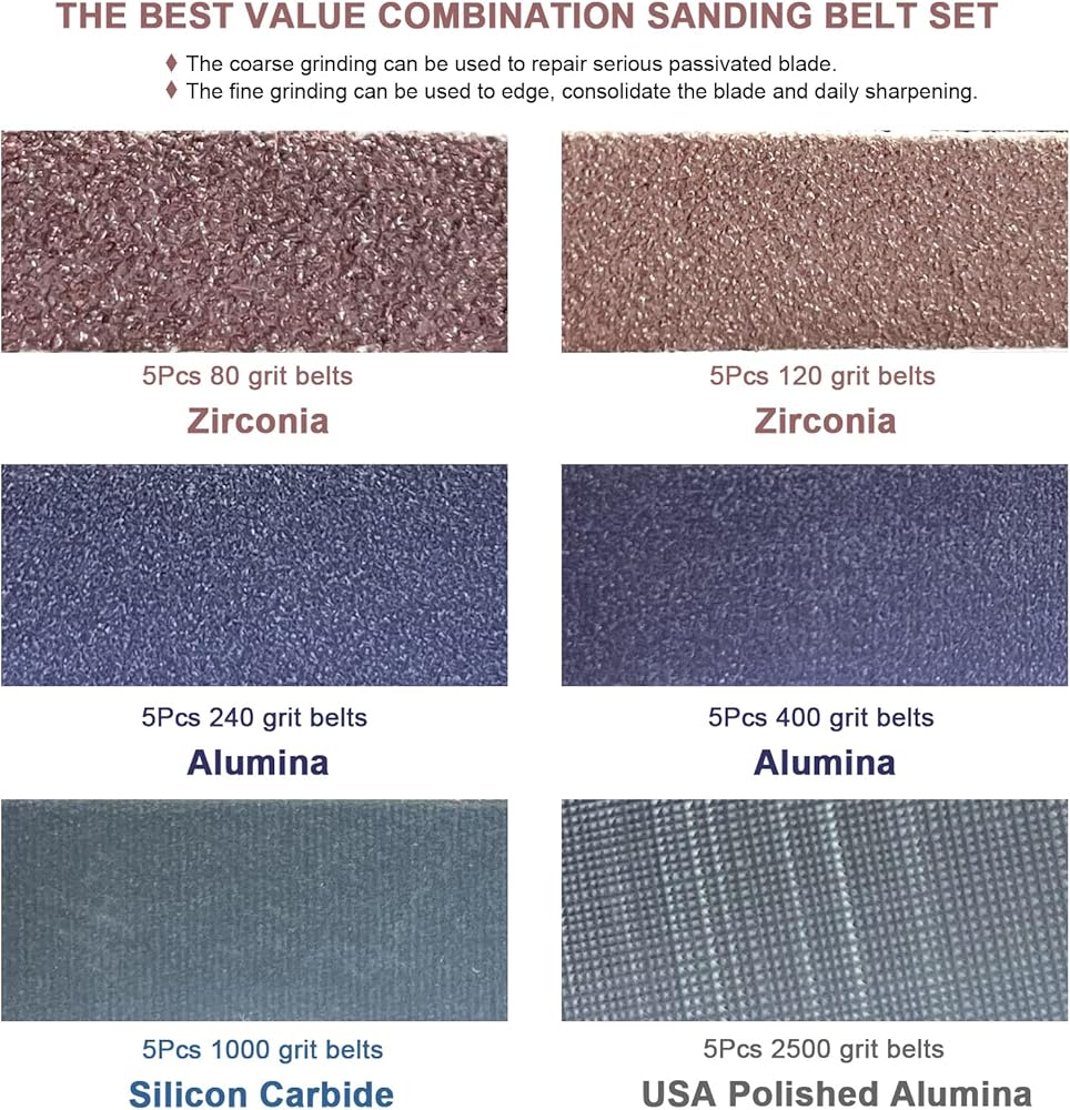 تتضمن العبوة: 30 عبوة أحزمة سنفرة لمبراة السكاكين 1/2 بوصة × 12 بوصة: 5 قطع أحزمة زركونيا 80 حبيبة، 5 قطع أحزمة زركونيا 120 حبيبة، 5 قطع أحزمة ألومينا 240 حبيبة، 5 قطع أحزمة ألومينا 400 حبيبة، 5 قطع أحزمة كربيد السيليكون 1000 حبيبة، 5 2500 قطعة من أحزمة الألومينا الأمريكية