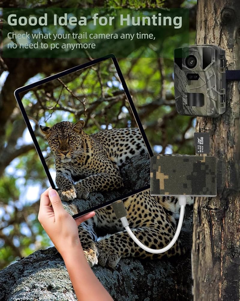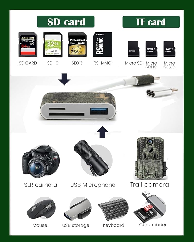 • Universal Compatibility: Designed for iPhones (5 to 17 Pro Max), iPad and android phones, it works with standard SD cards and TF card from major trail camera, wildlife camera, or digital camera brand