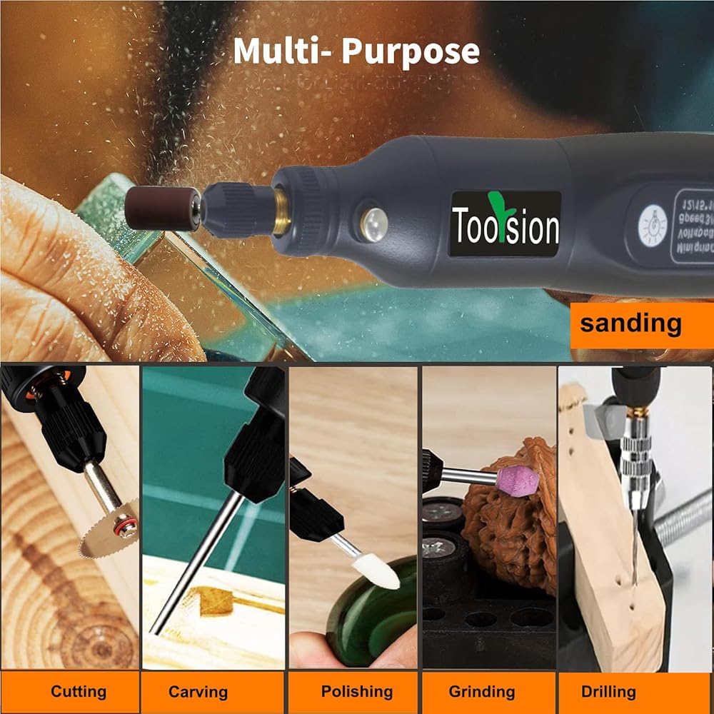 ملحقات الأدوات الدوارة: تأتي هذه المجموعة مع مجموعة شاملة من ملحقات الأدوات الدوارة، مثالية للنحت والصنفرة والتلميع. قم بتخصيص أدواتك لتناسب أي مشروع DIY أو مشروع تخصيص. أو نفاد الطاقة. استمتع بالإبداع المتواصل!