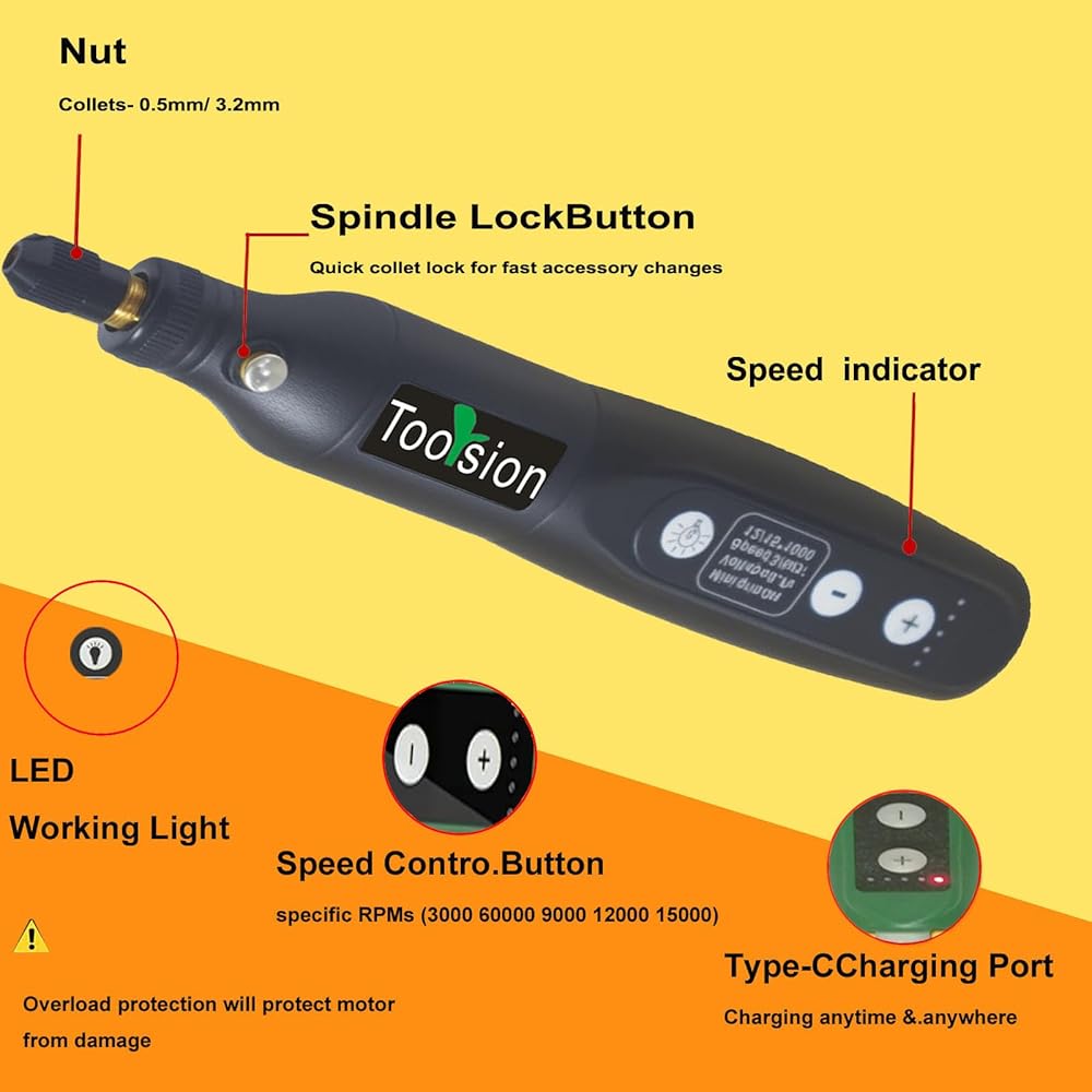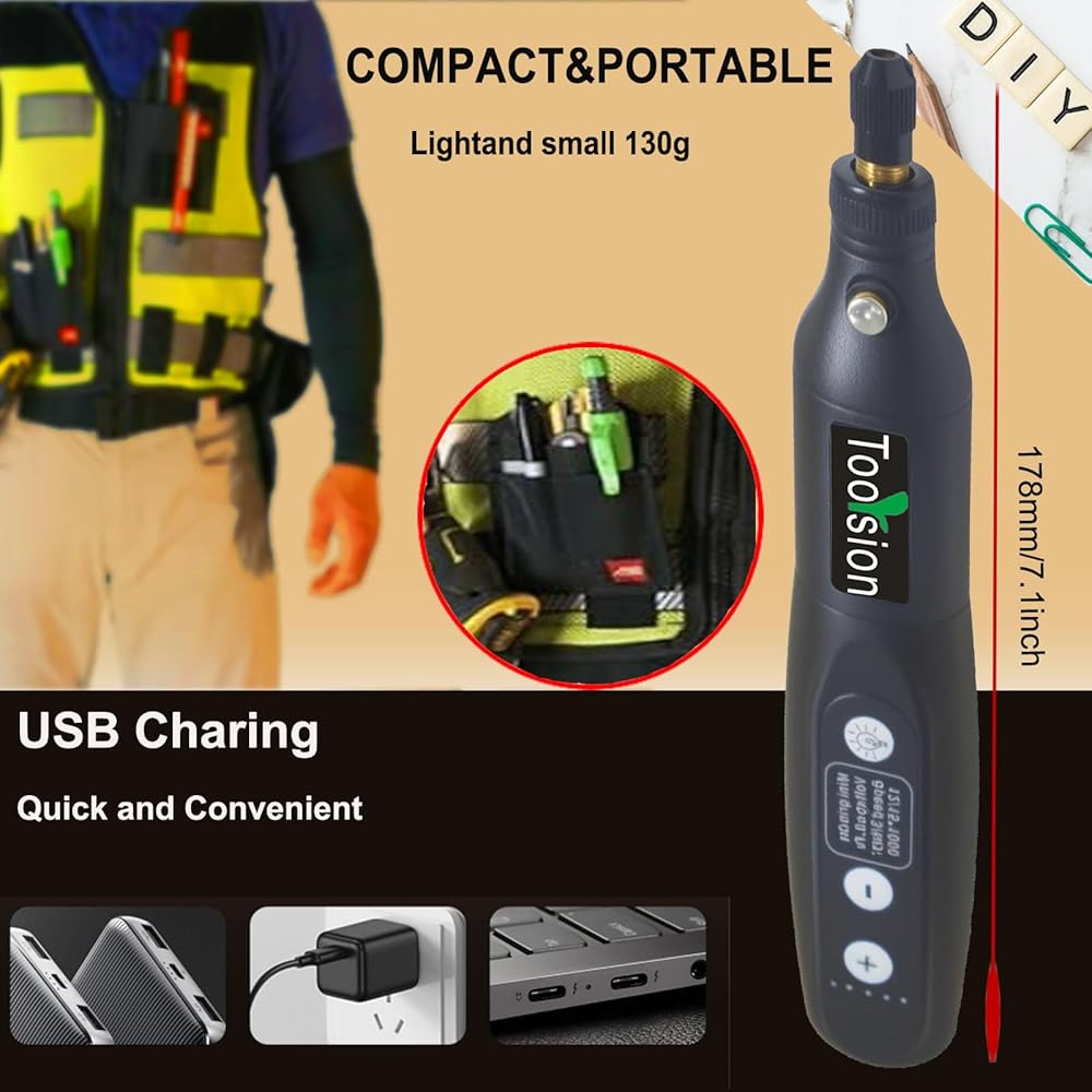 الراحة اللاسلكية: استمتع بحرية التصميم اللاسلكي مع بطارية قوية قابلة لإعادة الشحن، مما يسمح لك بالعمل في أي مكان دون متاعب الأسلاك. مثالية للمشاريع التفصيلية والحرفية أثناء التنقل.